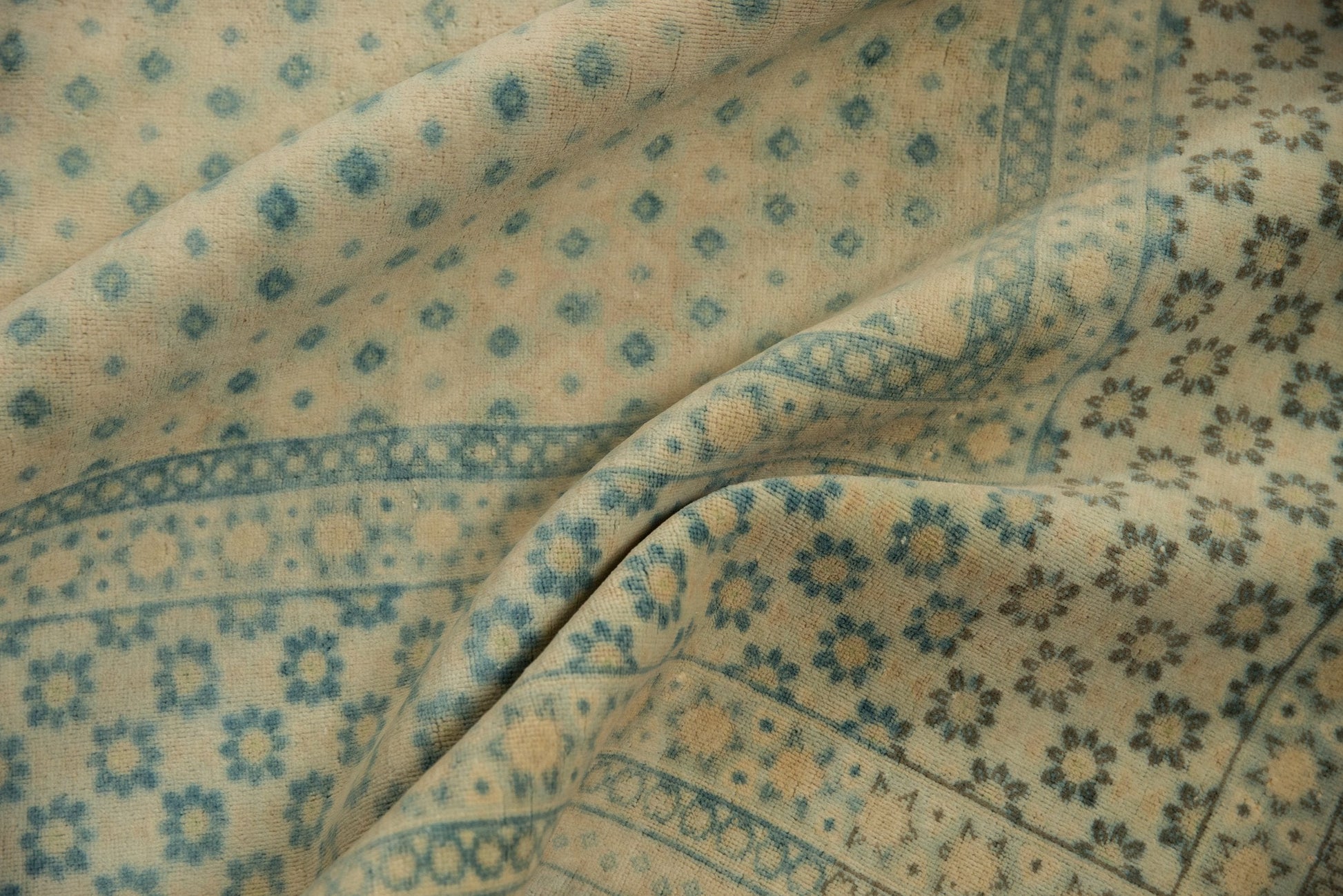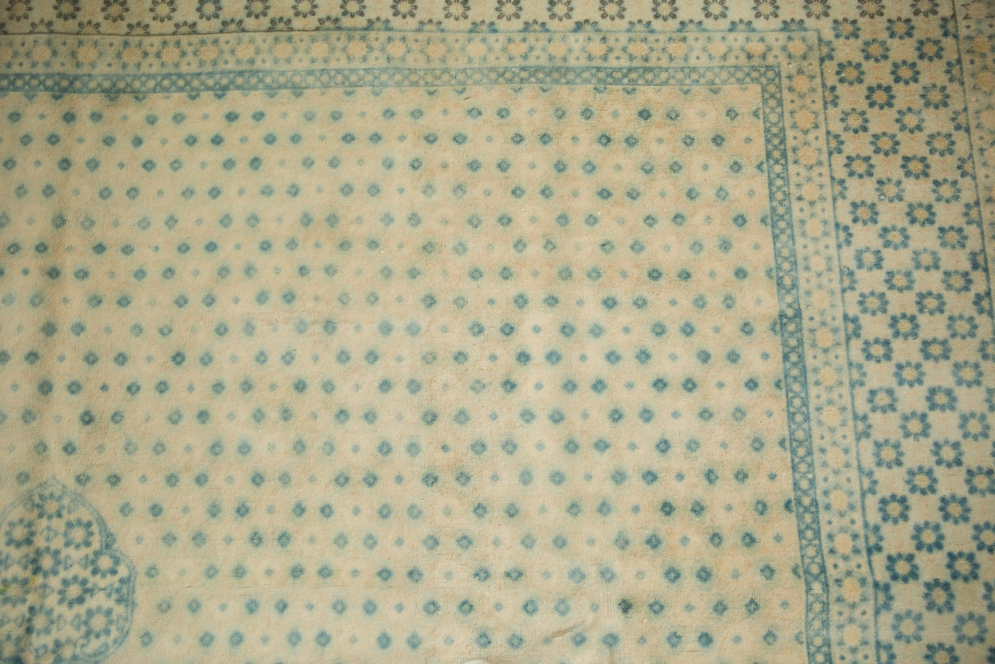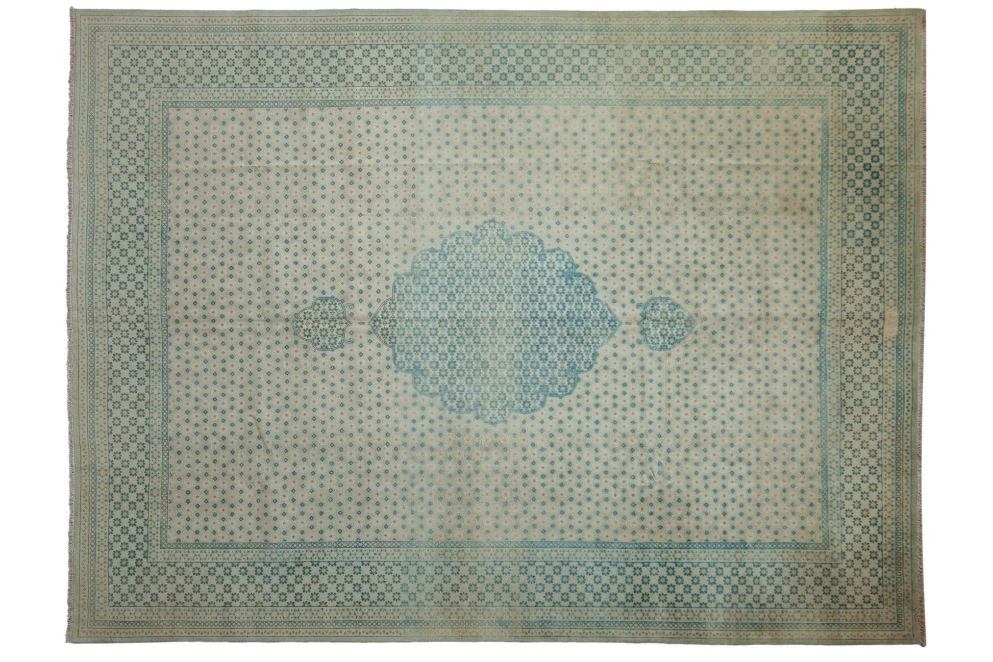 :: Center medallion with scalloped contour and trefoil shaped finials atop a covered ground and repeating main border. An unusual design in that the pattern of lattice oriented floral design elements are virtually uninterrupted from end to end of the carpet, and most any variation is strictly in the inverted coloration and fills with exception to minor thin outlines. At the top center of the outer minor border is a faded weaver inscription. Colors and shades include: Ivory, sky blue, indigo blue, sea foam green, cream, and more. Condition notes: Even wear across to knot heads. Original side cord selvages intact. Fully secured sides and ends. Recently professionally cleaned ready for in-home use! Many years of enjoyment to come with this hand knotted Bulgarian Tabriz design carpet made in Bulgaria circa 1950's vintage. Size measures 8'10" x 11'8".