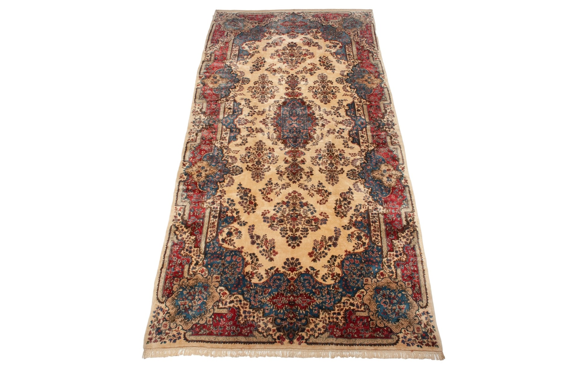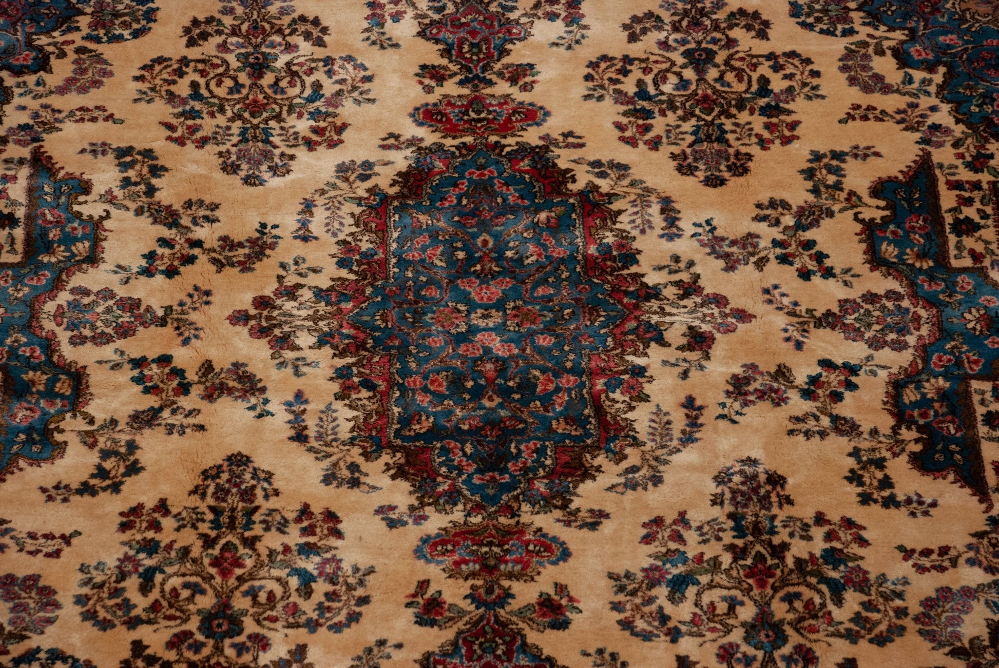 :: Center medallion atop a covered field of floral sprays with uniquely contoured step main border floating the main field with inwardly directed diminutive blossoms, Rococo stylization minor borders and intricate details throughout. Colors and shades include: Ivory, denim blue, cochineal red pink, blush, rose, pale coffee brown, and more. Condition notes: Like-new, original full pile height even across. Original side cord selvages intact. Fully secured sides and ends. Recently professionally cleaned ready for in-home use! Many years of enjoyment to come with this hand knotted Persian Kerman carpet made in Persia circa 1940's vintage. Size measures 9'2" x 19'9".