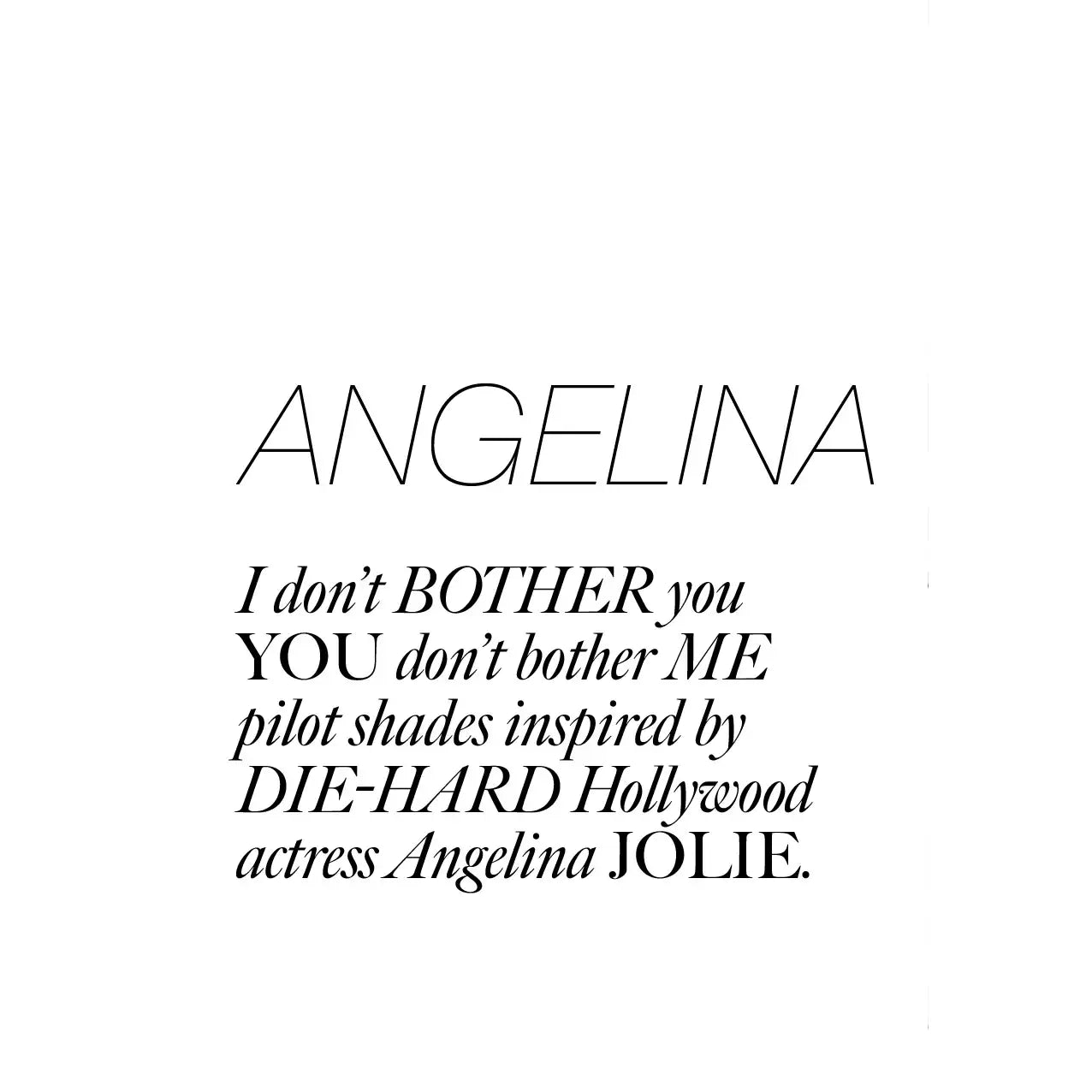 I don't bother you You don't bother me pilot shades inspired by die-hard Hollywood actress Angelina Jolie. Introducing the Cardsome Shades. Bold, elegant, and timeless design with a fusion of vintage glamour and modern sophistication. Handmade in Italy, using only top-quality materials and lenses extraordinaire – all crafted in tradition of the greatest Italian artisans. Inspired by strong, independent women. A shade or every day and mood, whether you are feeling sporty, glamorous, classy, sophisticated or chic. • Colour frame: Gold • Colour lense: Graded black • Composition: Metal • Handmade in Italy • 100% UV protection • Signature leopard wrapping & cloth Lens height: 52mm Lens width: 60mm Frame width: 140mm Bridge width: 15mm Temple length: 143mm