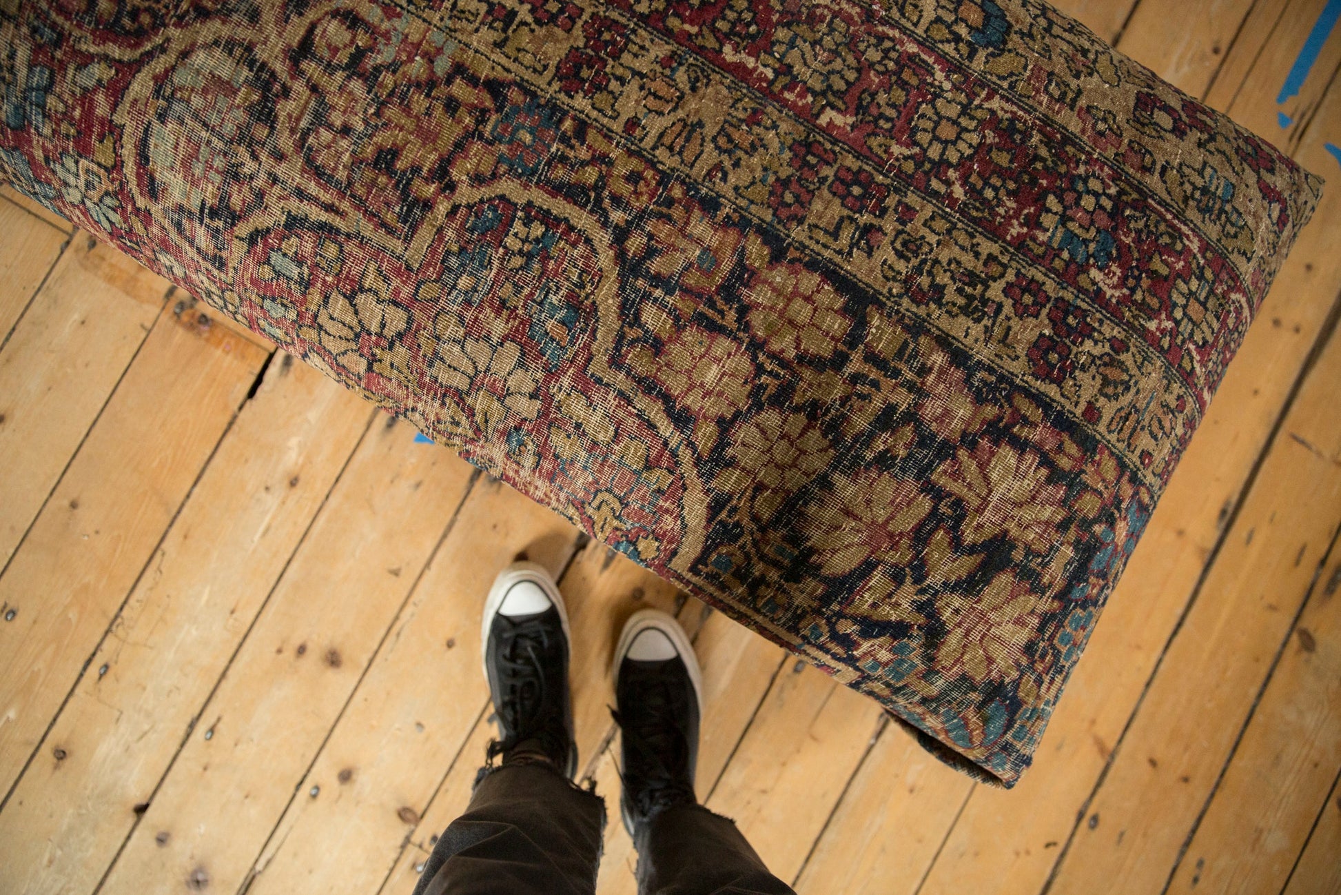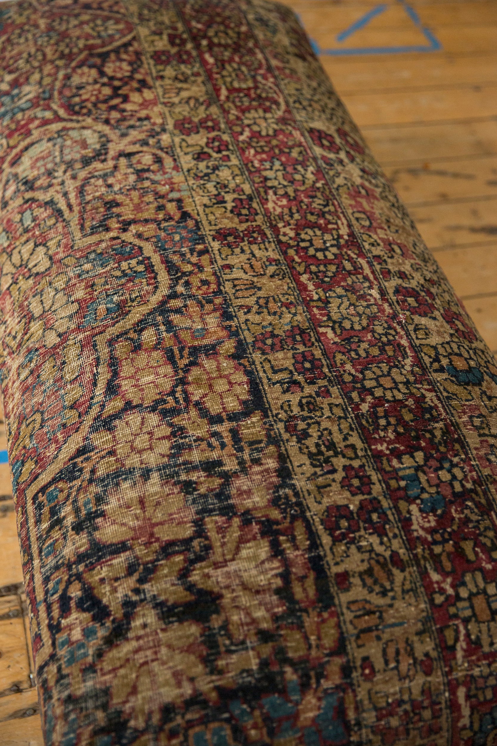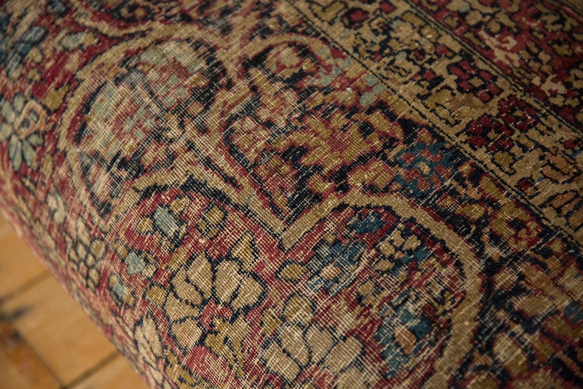 :: Exclusive Old New House® rug ottoman table! Made in-house in our Katonah NY studio, using reclaimed and repurposed awesome and unique antique 1900's Kerman Persian rug fragment that featuring gorgeous colors in shades of Ivory, cochineal red, dark navy blue, sapphire blue, beige, sand, and more. Stands on curved wooden legs and finished on underside with cotton canvas and brass studs. Measures 25" d x 54” l x 16" h. What a conversation piece of a furniture that is comfortable, versatile and gorgeous! As the fragment is vintage/antique, please note that there are signs of use and age like isolated wear / foundation showing, etc. as well as repairs made in house.