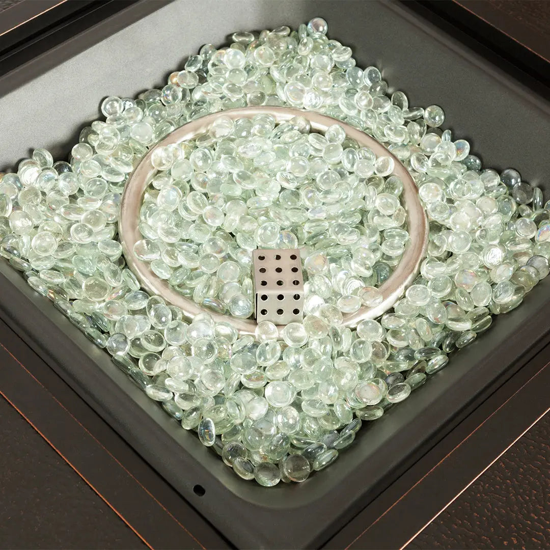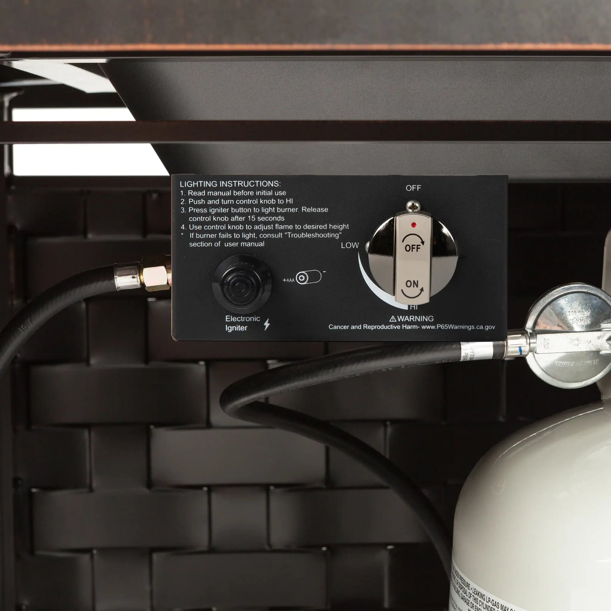 Compatible with any contemporary or traditional outdoor décor, the Armstrong 42" Square Basketweave Aluminum Fire Pit features an oversized split wood-style basketweave motif complemented by a subtly-pebbled table surface. With an Antique Bronze brushed finish, practical aluminum build, and an output of 55,000 BTU, this versatile fire pit pulls double duty as a patio table when you add the included fire bowl lid with flush-mounted handle. Arriving with clear fire glass for a stylish touch, just add a standard 20 lb. propane tank behind the convenient hinged door. A nylon cover for the fire pit is included for your convenience.