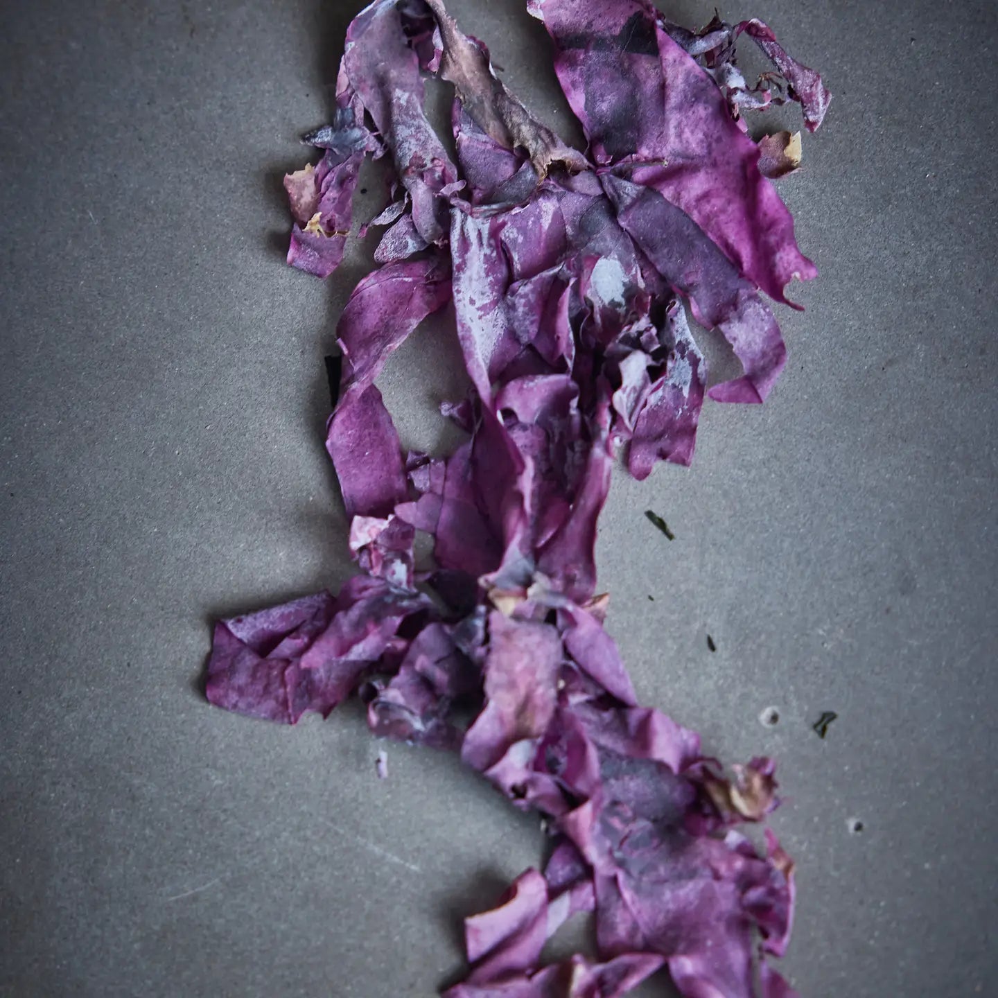 Dried organic dulse from Lofoten. When dried, dulse has a smoky sweetness with hints of liquorice and nuts that makes it a great snack food. It’s often referred to as ocean bacon, or vegan bacon. Powdered dulse infuses very well into dairy products like milk or cream, leading to interesting flavours similar to Japanese matcha tea. Shelf life: 5 years from date of harvest. Often good after. Storage: Room temperature and dry.