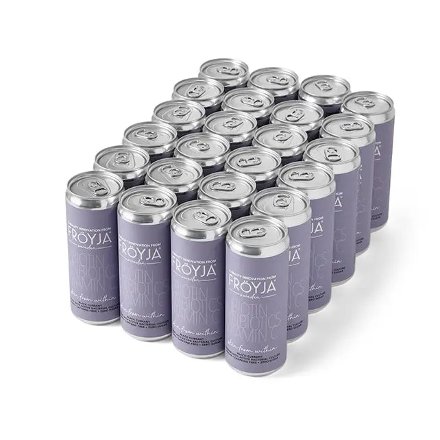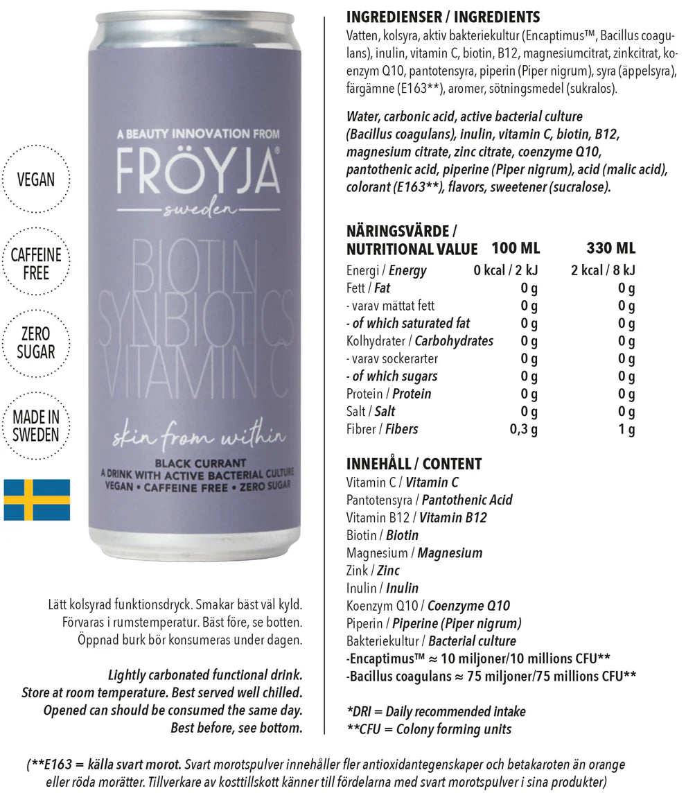 Fröyja is specially formulated to maintain a normal and healthy skin, it is also beneficial for your gut and hair. Active bacterial culture (probiotics + prebiotics = synbiotics) is one of our most important ingredients. Since the stomach plays a central role in our well-being, it is essential to start by taking care of the stomach to promote health and skin. Black currant seed also includes Magnesium, Zinc, Vitamin C, Biotin, Piperine, Q10, Pantothenic acid and B12. Fröyja is a caffeine-free drink, caffeine inhibits our absorption of important vitamins and minerals. There it can be consumed by everyone at any time, including nursing mothers, pregnant women, and children. Winner of the prize “Best beauty from within” at Stockholm beauty week award.