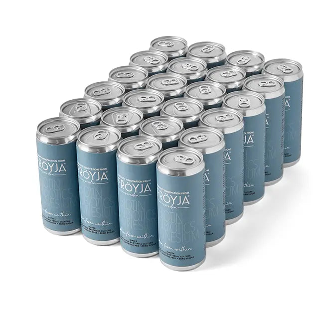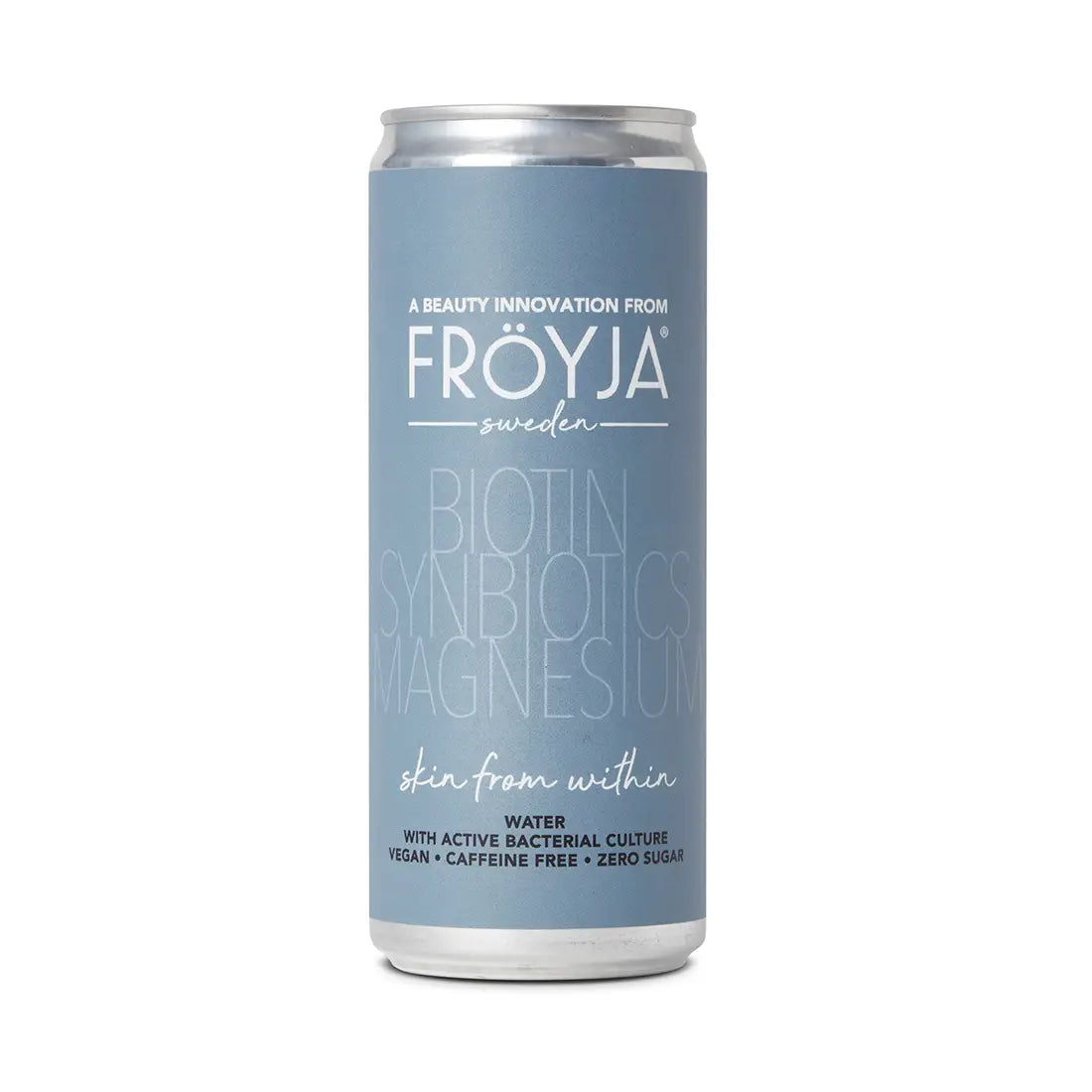 FRÖYJA, a drink with synbiotics (prebiotics and probiotics), vitamins, and minerals. Caffeine-free, sugar-free, vegan, and made in Sweden. Enhances health and skin, developed by skincare therapists.