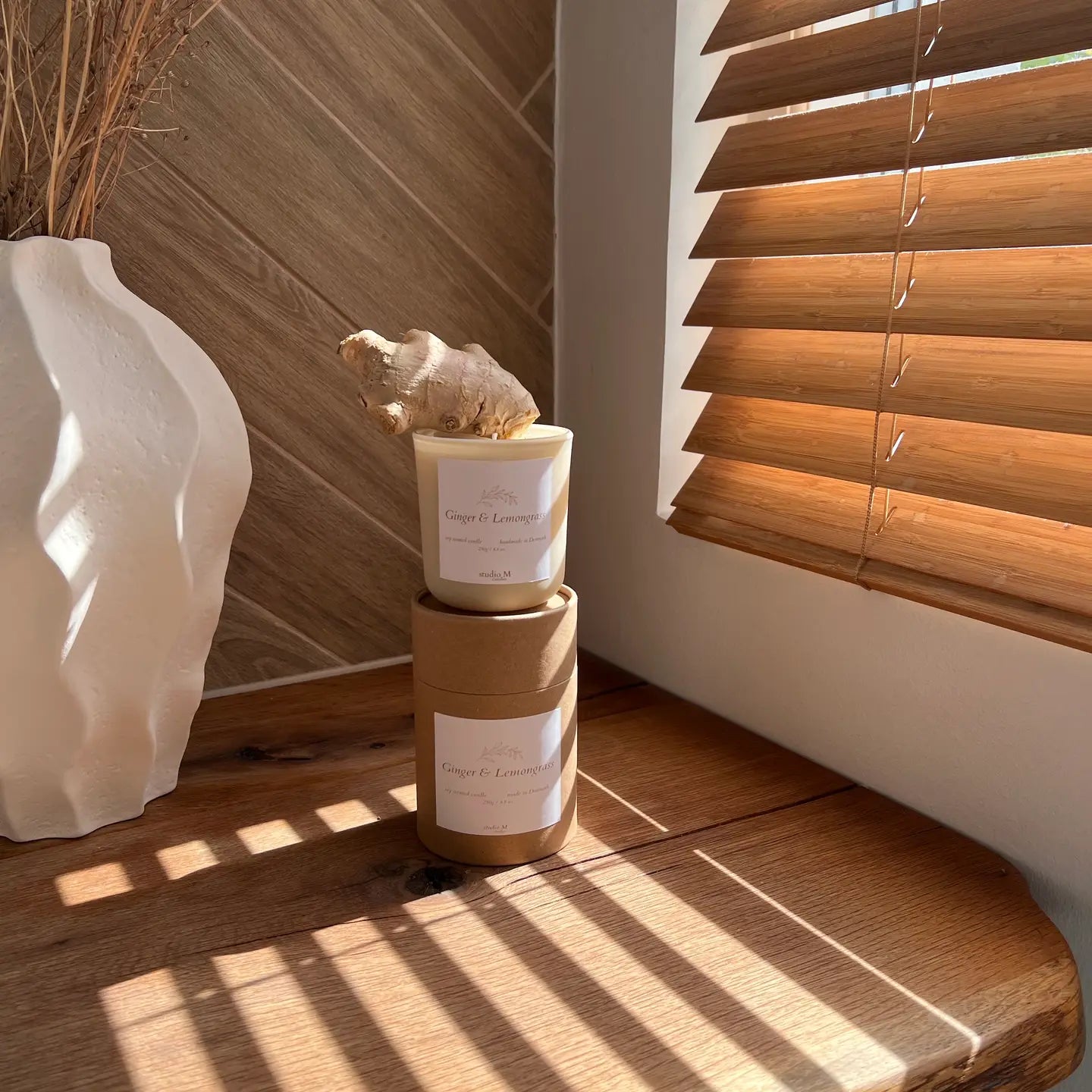 Ginger and lemongrass fragrance oil is a harmonious marriage of two very different notes, perfectly created for each other. The sharp, peppery brightness of ginger, enhanced with a hint of fresh lemon at the top, blends delightfully with the stimulating green tone of lemongrass and geranium in the middle, creating a fantastic mood-boosting combination that will cheer up any mood. An earthy base of musk, patchouli, and cedarwood enhances this marriage to eternal happiness! • vegan 100% soy wax, • highest quality fragrance oils - 100% concentrated paraben-free, compliant with IFRA and EU regulations and not tested on animals. All fragrance oils are free from phthalates and CMR substances, • 2 pieces of cotton wicks, • soft-touch organic glass, container made in the EU from environmentally friendly glass and is an example of craftsmanship of the highest quality, • cardboard containers categorized as FSC mixed sources, 70% of the materials come from recycled content and 30% come from recycled wood. Notable design elements include liners and rolled edges, water-resistant. • 250 g / 35-40 hours