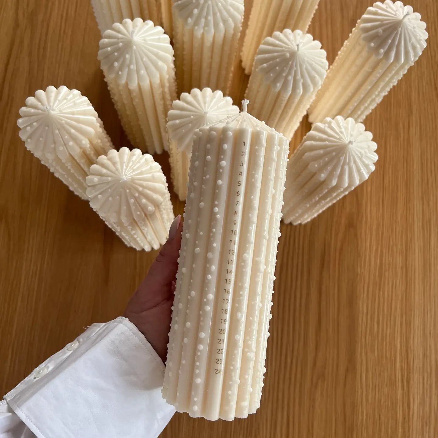 Advent candle - Danish tradition Scandinavian aesthetics Handmade Let it snow with white dots Number strip from 1 to 24 94% soy wax & 6% paraffin Burn time approx. 90 hours Unscented Cotton wicks Dimensions 20x7 cm