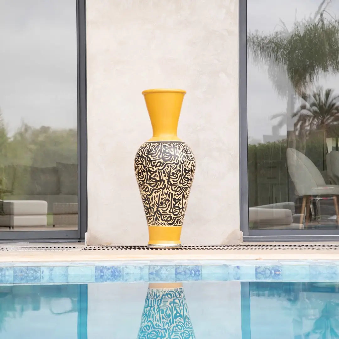 Let yourself be seduced by the majesty and refinement of the “LYA IMPERIAL” jar, an emblematic piece from the “Essaouira” collection signed BY M DECORATION. Meticulously crafted by the skilful hands of our family, every detail of this jar embodies the pinnacle of French luxury. Standing proudly at 1m20 and featuring a delicate opening, the “LYA IMPERIAL” jar is a true haven of elegance. Its patterns, set on a yellow background, recall the magic and sophistication of Essaouira, this Moroccan jewel caressed by the waves. Designed to sit directly on the ground, its imposing silhouette will bring unparalleled grandeur to your spaces, indoors and outdoors. Its daring design, at the crossroads of tradition and modernity, is an exceptional guarantee that will magnify every corner of your home. Height: 1m20 Opening: 33cm Widest diameter: 50 cm