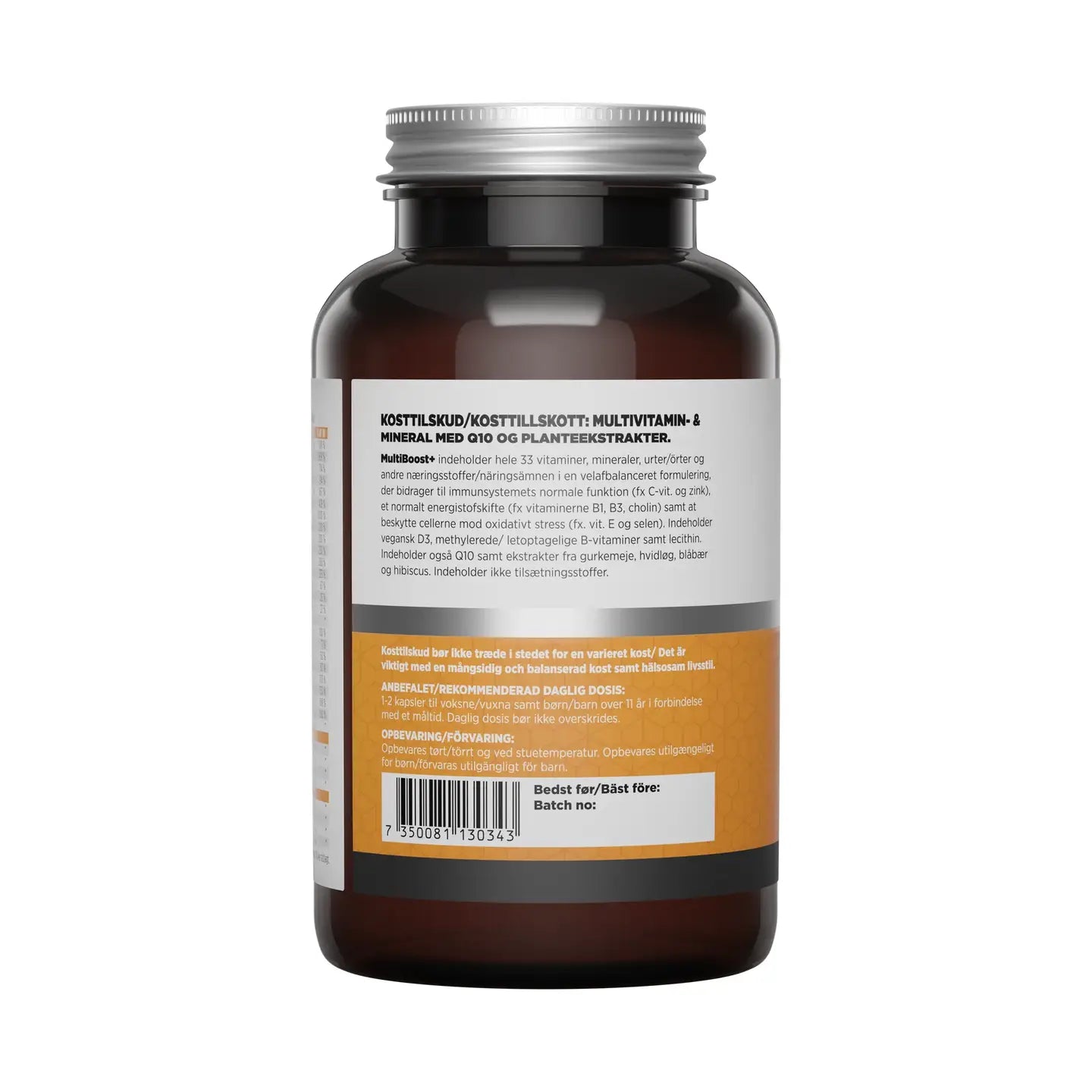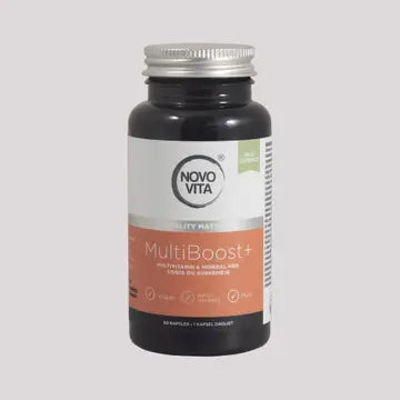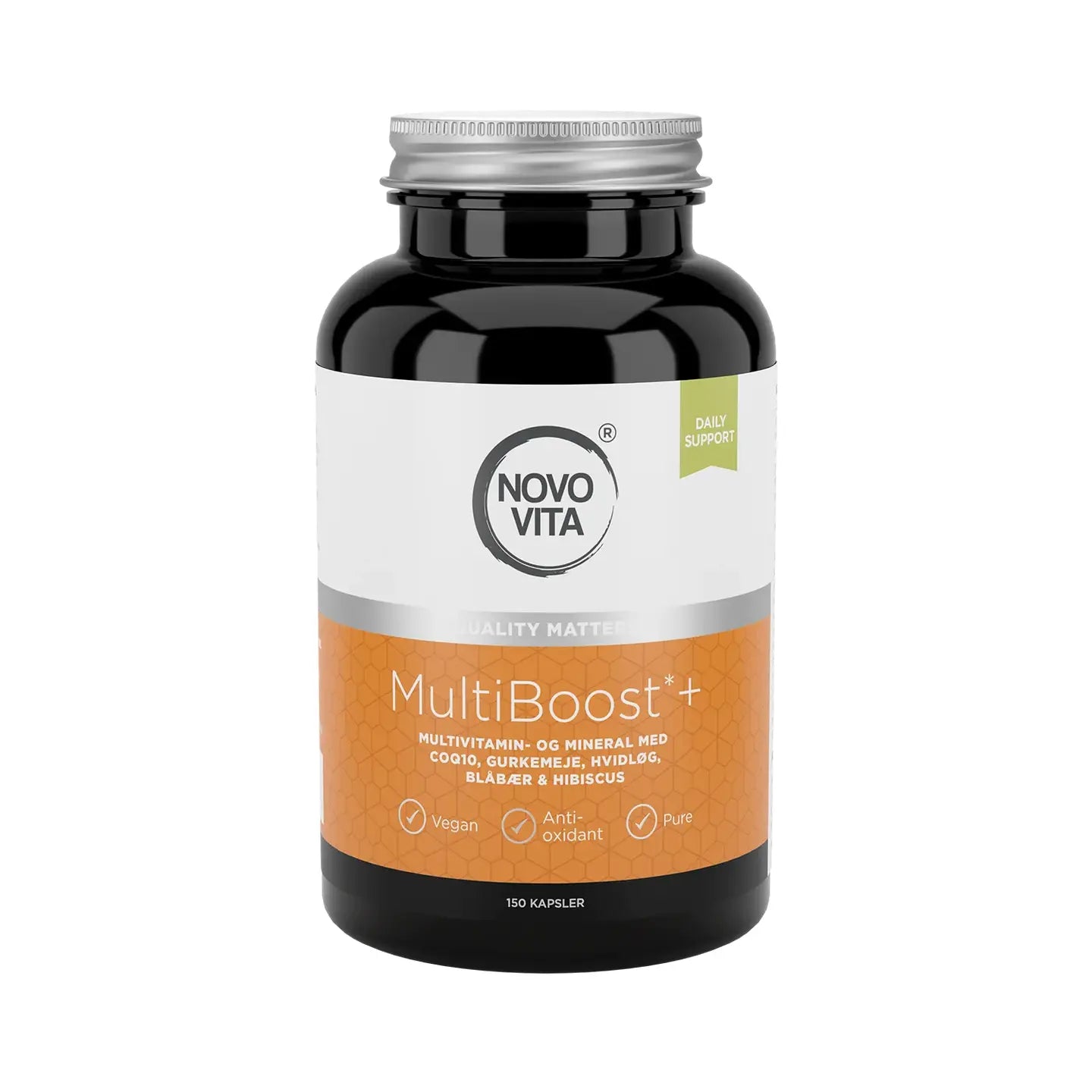 MultiBoost+ contributes to, among other things, the *immune system (including vitamin C and zinc), *energy metabolism (including vitamin B1, B3, B3-vit and choline) and protection against oxidative damage (including vitamin E and selenium). Multiboost+ also contains the herbs turmeric, odorless garlic, blueberries, hibiscus and coenzyme Q10.