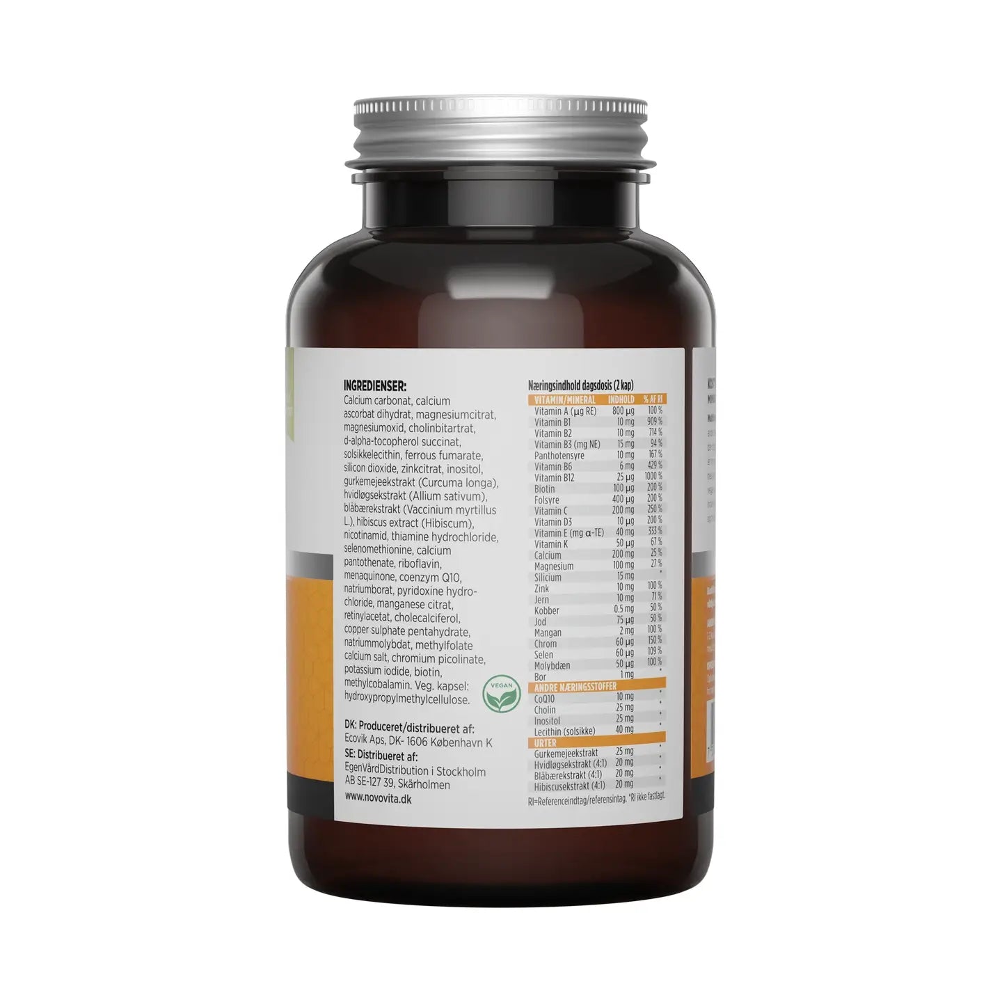 Calcium carbonate, calcium ascorbate dihydrate, magnesium citrate, magnesium oxide, choline bitartrate, d-alpha-tocopherol succinate, sunflower lecithin, ferrous fumarate, silicon dioxide, zinc citrate, inositol, turmeric extract (curcuma longa), garlic extract (Allium sativum), blueberry extract (Vaccinium myrtillus L.), hibiscus extract (hibiscum), nicotinamide, thiamine hydrochloride, selenomethionine, calcium pantothenate, riboflavin, menaquinone, coenzyme Q10, sodium borate, pyridoxine hydrochloride, manganese citrate, retinyl acetate, cholecalciferol, copper sulphate pentahydrate, sodium molybdate, methylfolate calcium salt, chromium picolinate, potassium iodide, biotin, methylcobalamin. Vegetable capsule: hydroxypropylmethylcellulose
