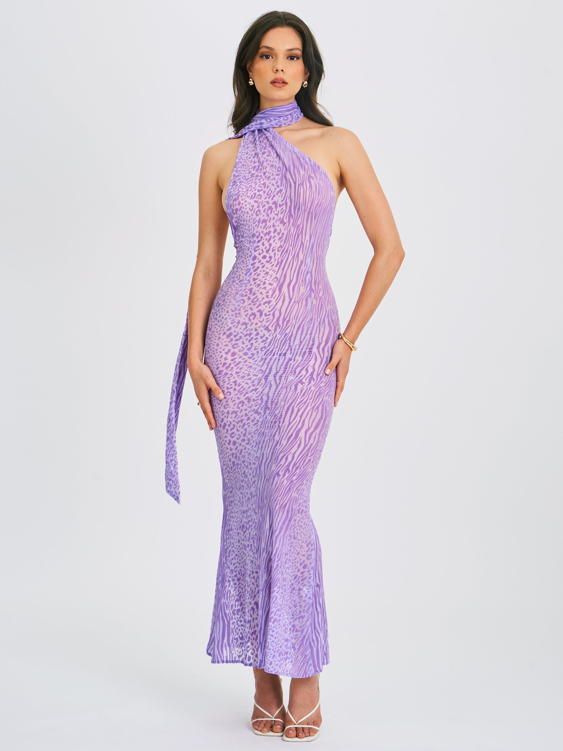Introducing the Olena, a captivating Purple Burnout Velvet Animal Print Mesh Halter Neck Maxi Dress perfect for summer. This dress features a halter neck design, an alluring open back with button closures, and intricate burnout velvet detailing. The flowing maxi mermaid silhouette enhances your natural curves, while the high-stretch fabric ensures comfort and a sleek look. Ideal for beachside parties, sunset dinners, or any special occasion, the Olena dress will make you the center of attention. Embrace the summer vibes with this stunning piece.