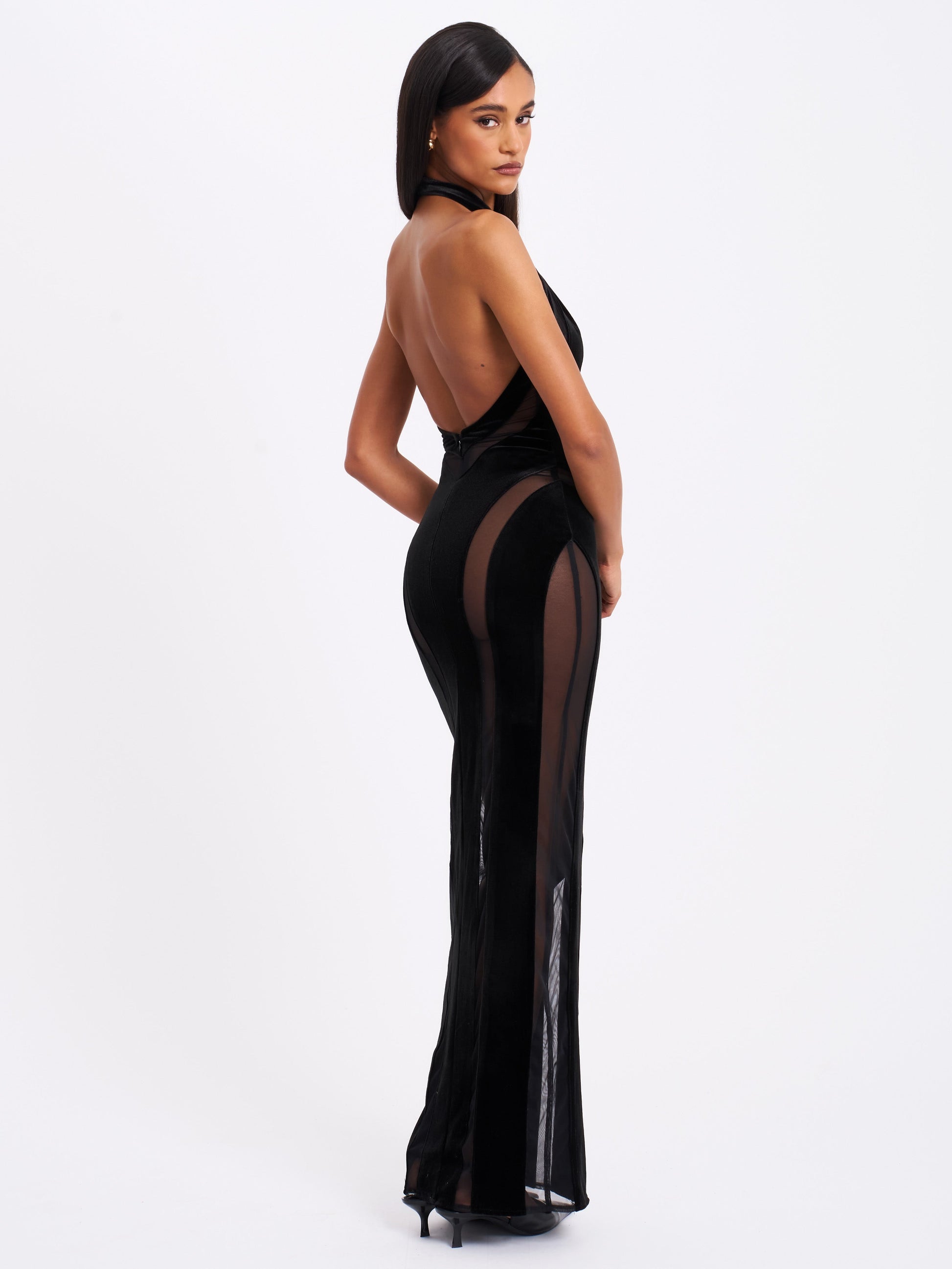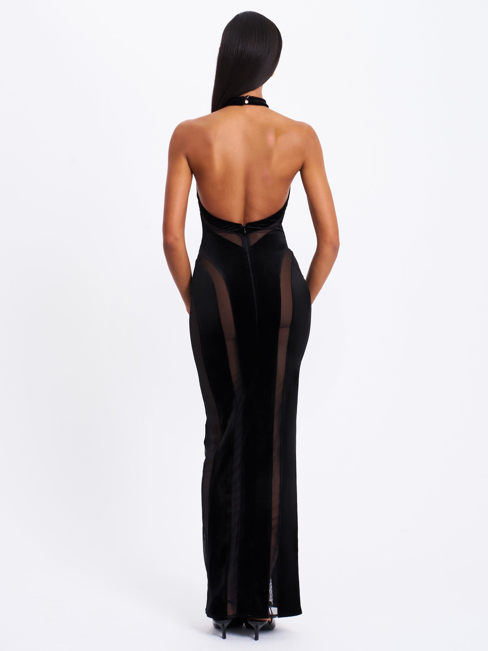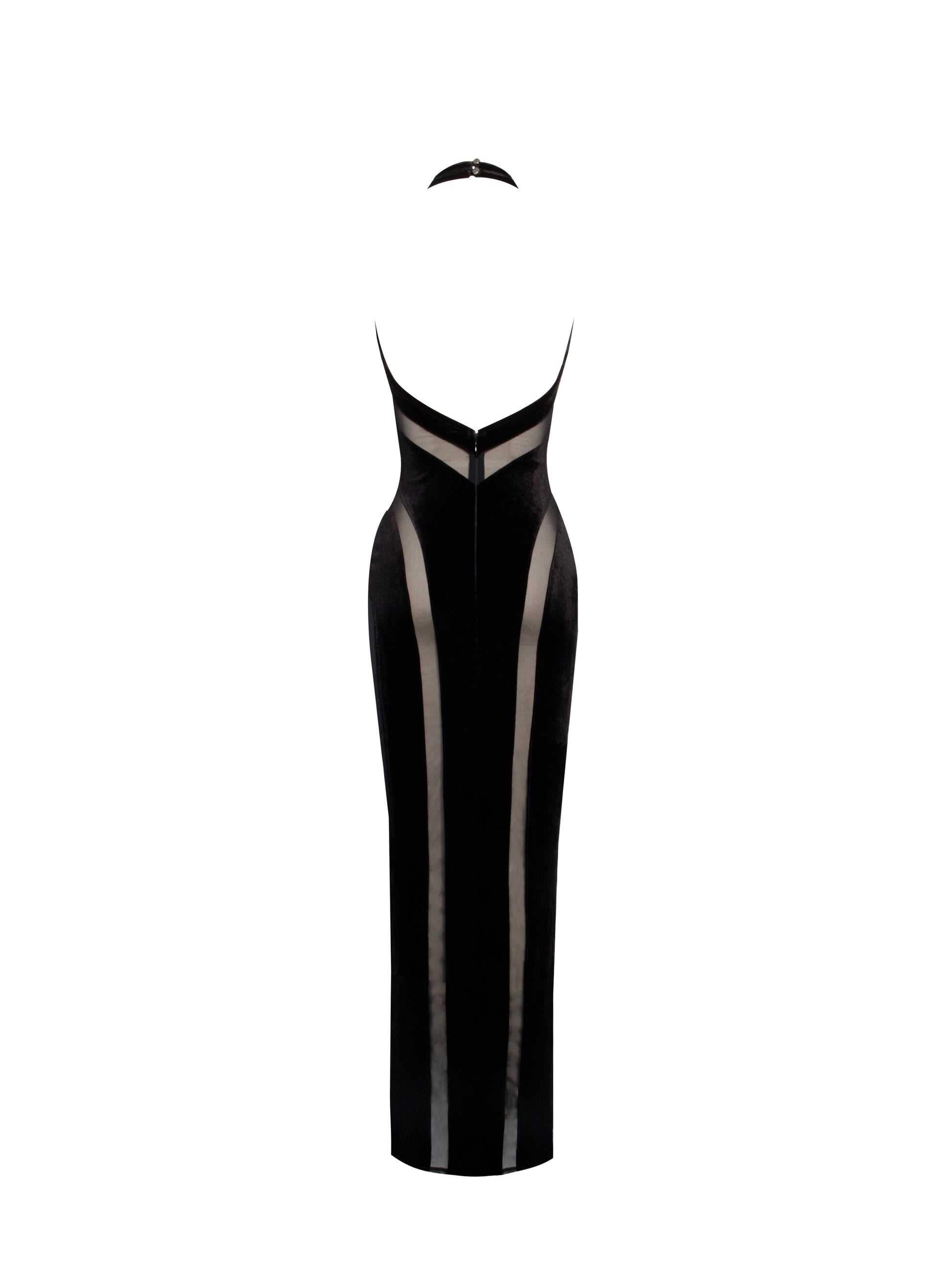 Turn heads with the sultry elegance of the Paityn Dress, a stunning masterpiece designed to captivate. Crafted with a luxurious velvet base, it features daring mesh cutouts that add a modern edge. The halter neck highlights your shoulders, while the keyhole cutout and backless design add allure. A V-shape waistline enhances your curves, flowing into a sleek maxi straight skirt with a high-rise cutout to showcase your leg and accentuate your figure. Finished with an invisible zipper for a seamless fit, the Paityn Dress is the perfect blend of sophistication and sensuality.