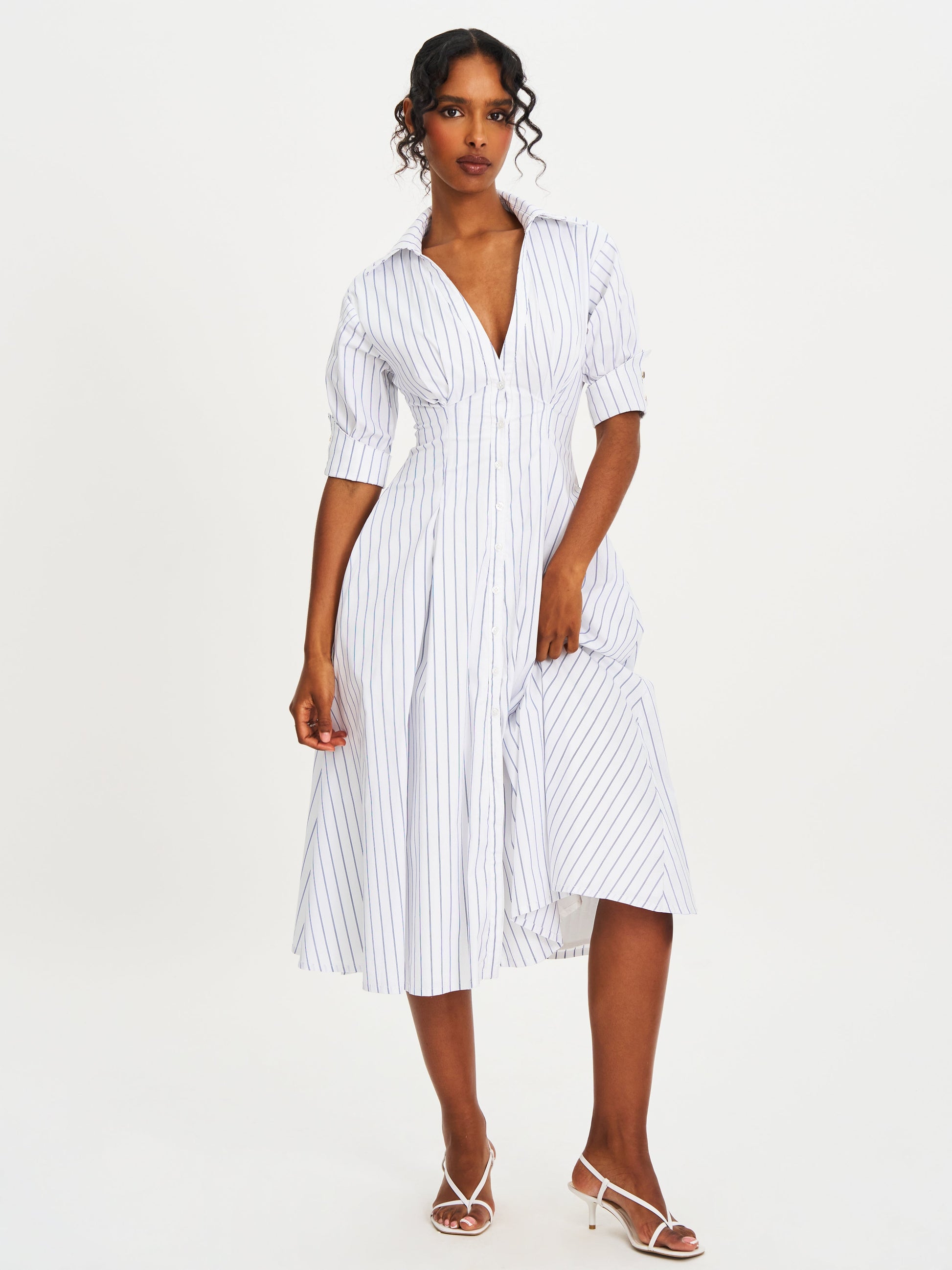 Palina Pinstripes Cotton Poplin Pleated Midi Preppy Shirt Dress