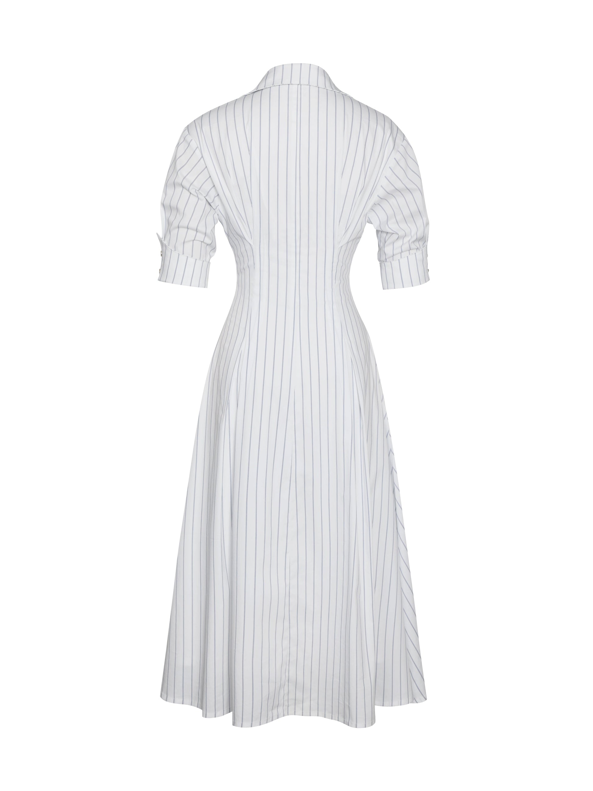 The Palina Dress redefines preppy elegance with its timeless shirt dress silhouette. Made from breathable Cotton Poplin fabric, this midi-length dress features delicate pleated detailing and pinstripes that adds a touch of sophistication. The button-up front and black cuff buttons create a polished business casual look, perfect for both formal and daily wear. Thoughtfully designed with invisible pockets, this versatile white dress is a wardrobe staple for effortless style and comfort.