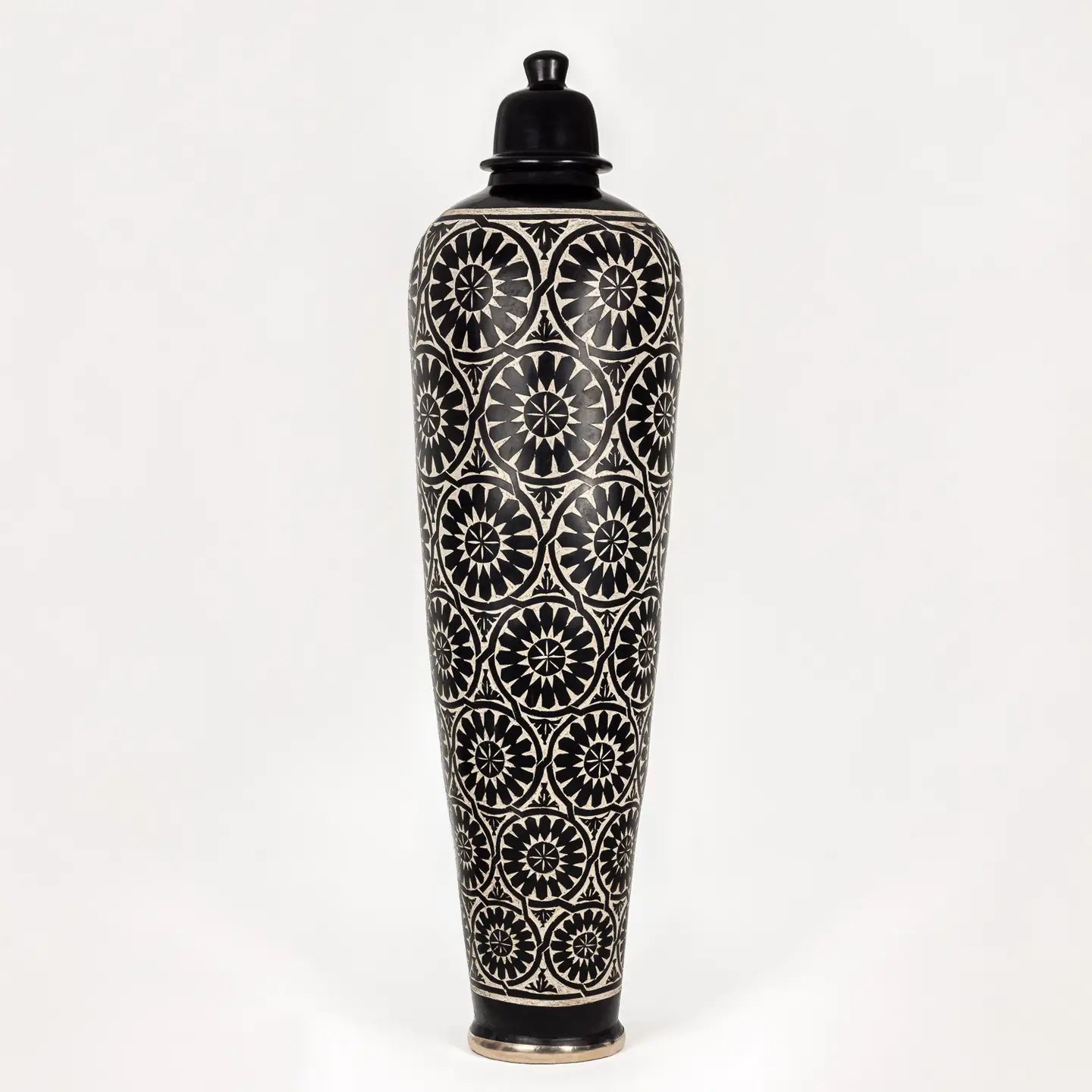 et yourself be seduced by the majesty and refinement of the “PELA ASIA” jar, an emblematic piece from the “Essaouira” collection signed BY M DECORATION. Meticulously crafted by the skilful hands of our family, every detail of this jar embodies the pinnacle of French luxury. Standing proudly at 1m70 and with a delicate opening, the “PELA ASIA” jar is a true haven of elegance. Its white patterns, set on a black ebony background, recall the magic and sophistication of Essaouira, this Moroccan jewel caressed by the waves. Designed to sit directly on the ground, its imposing silhouette will bring unparalleled grandeur to your spaces, indoors and outdoors. Its daring design, at the crossroads of tradition and modernity, is an exceptional guarantee that will magnify every corner of your home. The “PELA ASIA” jar transcends simple decoration: this jar is an ode to exclusivity and refinement.