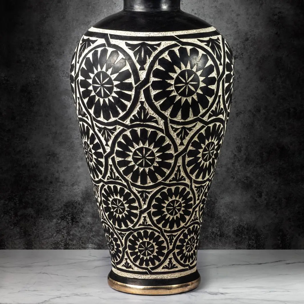 Inspired by the serene landscapes of the North, the Pela jar merges Scandinavian minimalism with the delicate art of ceramics. Its pristine black surface, decorated with black patterns evoking the pampas, fits harmoniously into any space, interior or exterior. Its graceful curves and fine texture are an invitation to relax. Whether you have plants, dried flowers, or a vibrant bouquet, Pela will enhance every corner with undisputed Nordic charm.