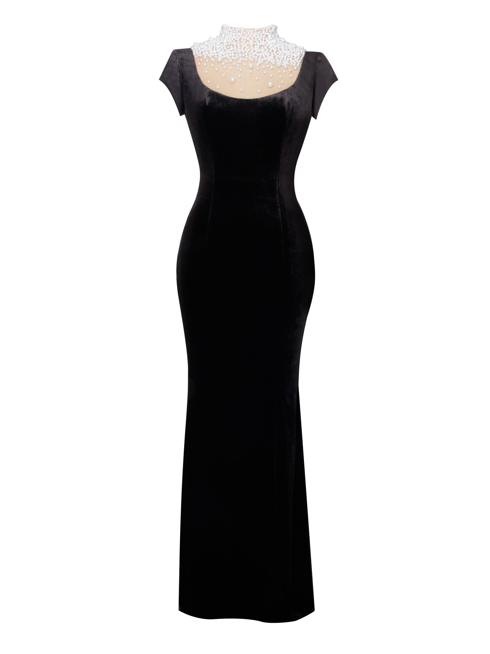 Introducing the epitome of elegance, the Rachael Gown. This breathtaking gown features a luxurious black velvet body, beautifully tailored to a mermaid silhouette that hugs your curves and flares gracefully at the hem. The delicate mesh turtleneck, adorned with shimmering pearl embellishments, adds a sophisticated and modern touch, while the chic cap sleeves enhance the sleek design. A cinched waist creates a flattering, hourglass figure, making this gown perfect for any occasion where timeless elegance is a must. And it makes a perfect match with our Pearl Handbag.