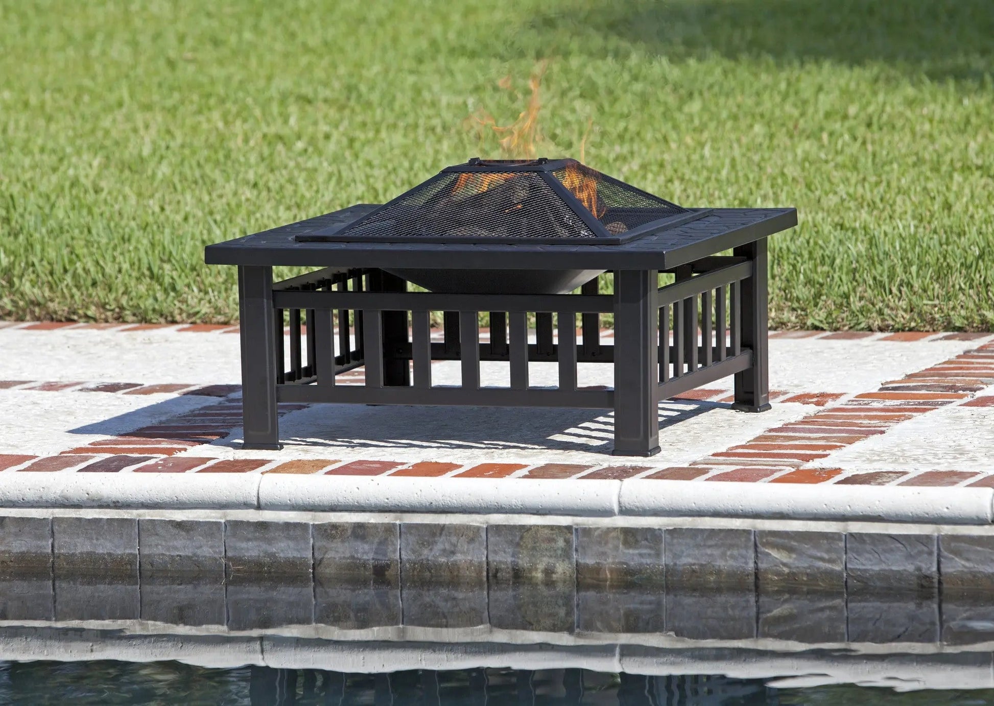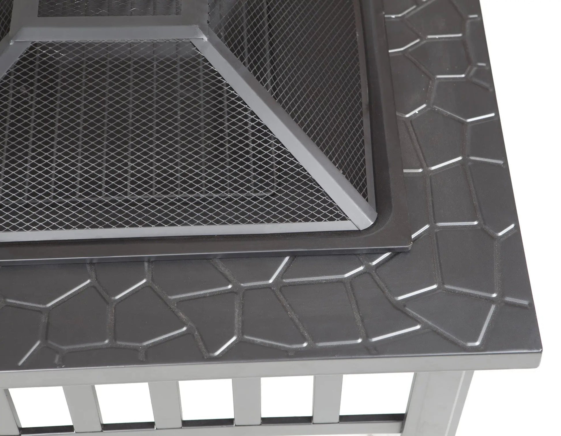 Stonemont Square Fire Pit, This unique fire pit features a 23" black steel fire box with a stone-look rim top and a decorative mission-style base. This fire pit comes complete with mesh dome spark screen with high heat paint and a wood grate. Also included is a screen lift tool.