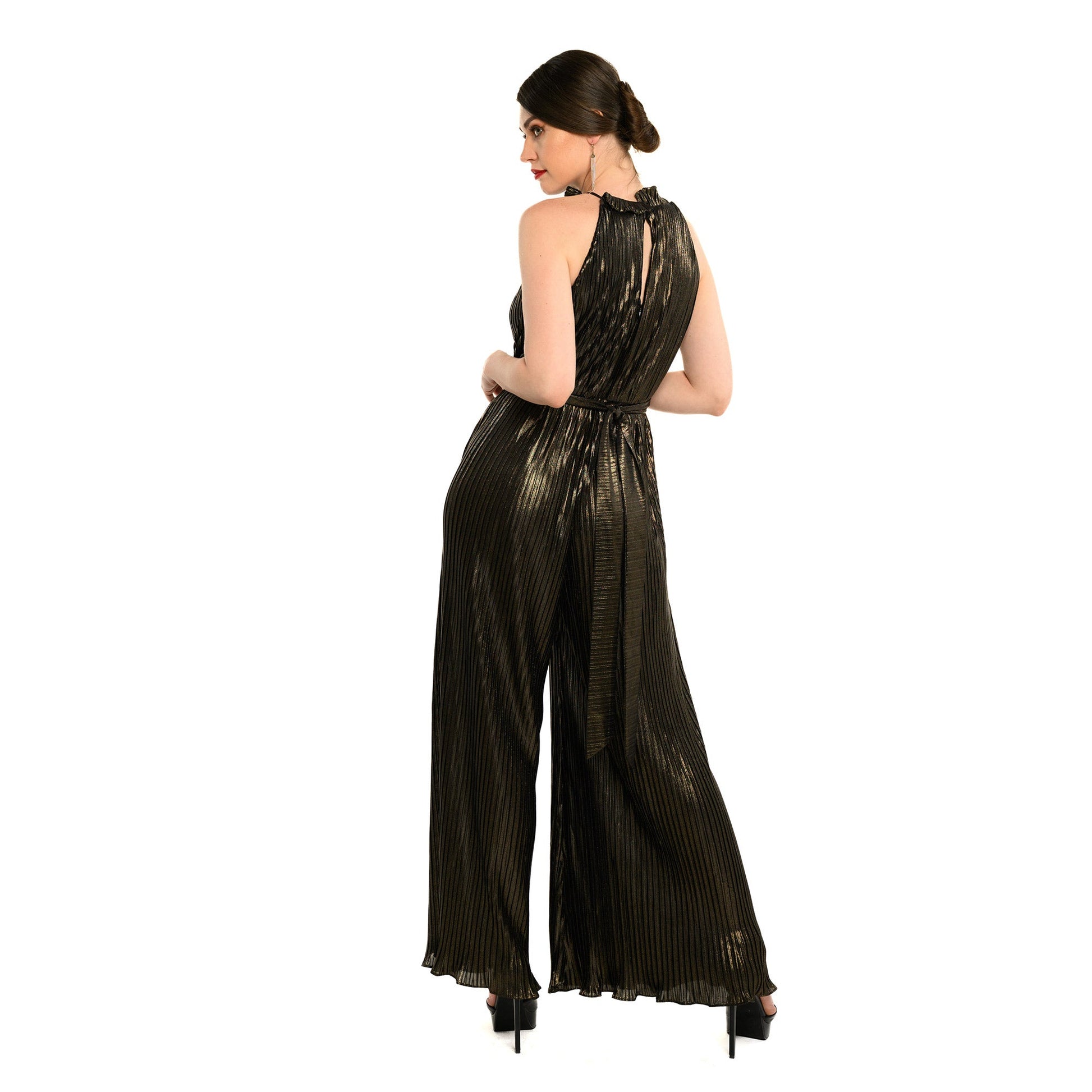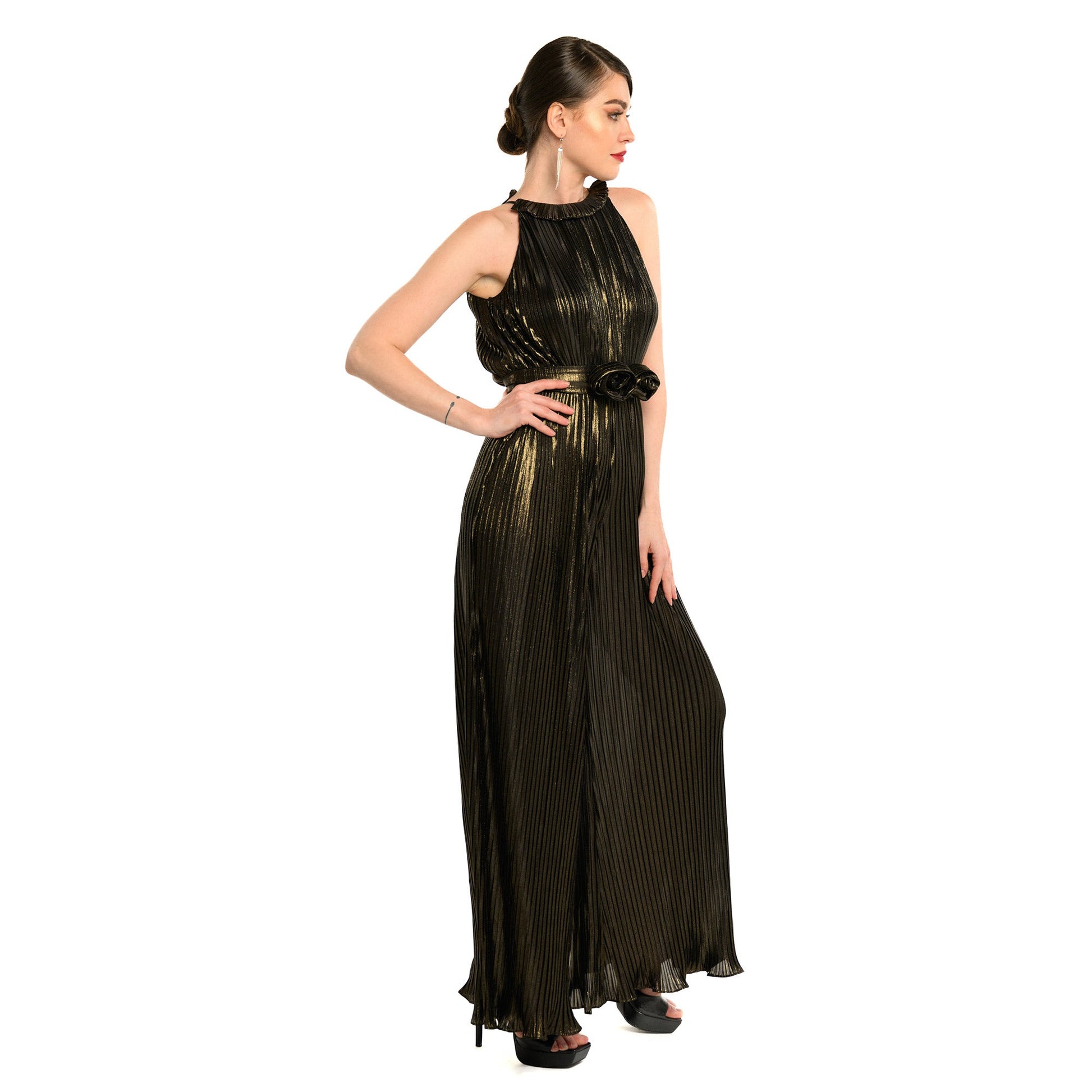 Exude elegance and elevate your appearance with The Bardot's Unique Halter Palazzo Jumpsuit. Meticulously tailored from opulent Pleated Luxered Novelty Fabric in a striking combination of gold and black, this jumpsuit is guaranteed to make a statement. The sophisticated halter neckline and eye-catching rose belt accentuate your figure, while the palazzo style offers unparalleled comfort and freedom of movement. From formal occasions to evenings out, the full length design exudes timeless class and refinement. Make a lasting impression and command attention with this dazzling piece.