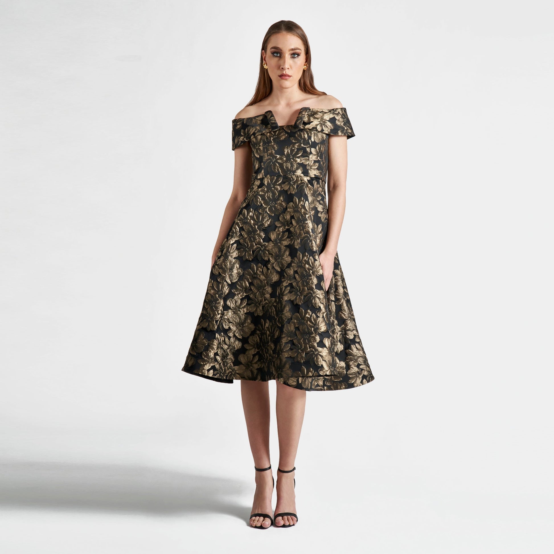 The Catherine is the ultimate choice for any affair, combining our best seller off the shoulder design with a luxurious antique gold and black brocade. Its signature fit and flare silhouette will make you stand out in sophistication and elegance. Limited edition.