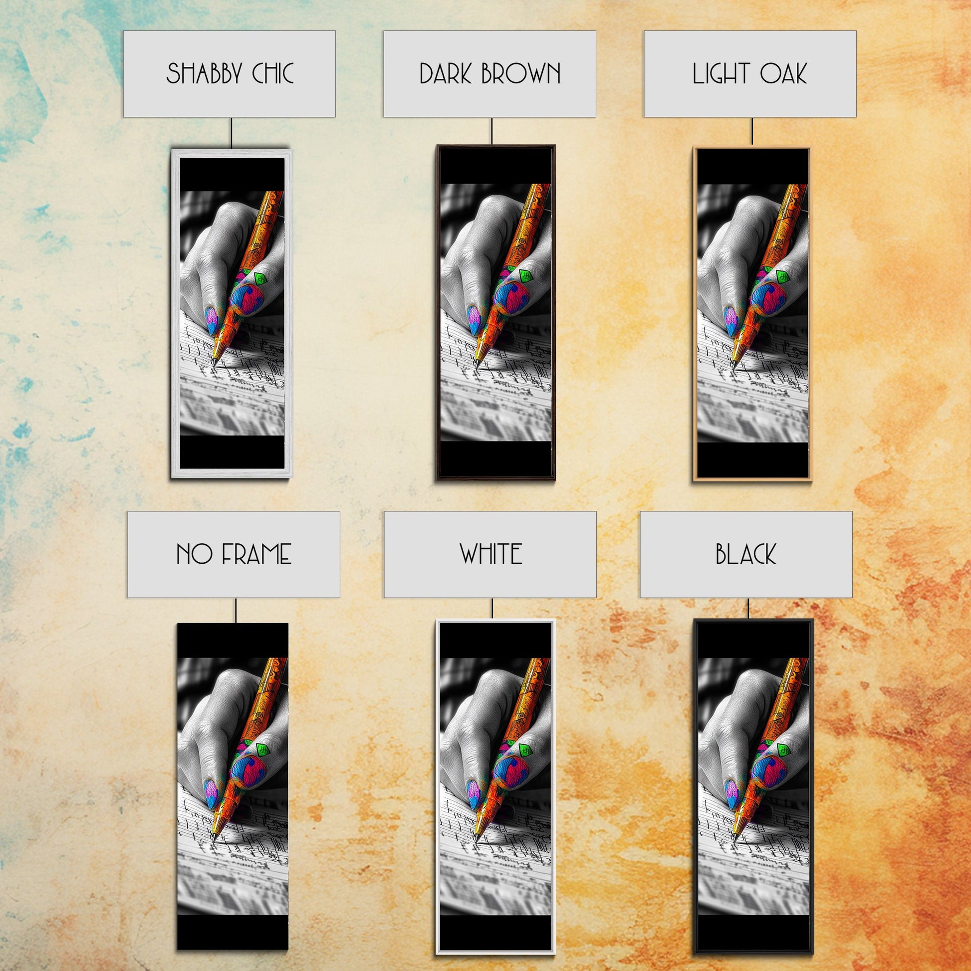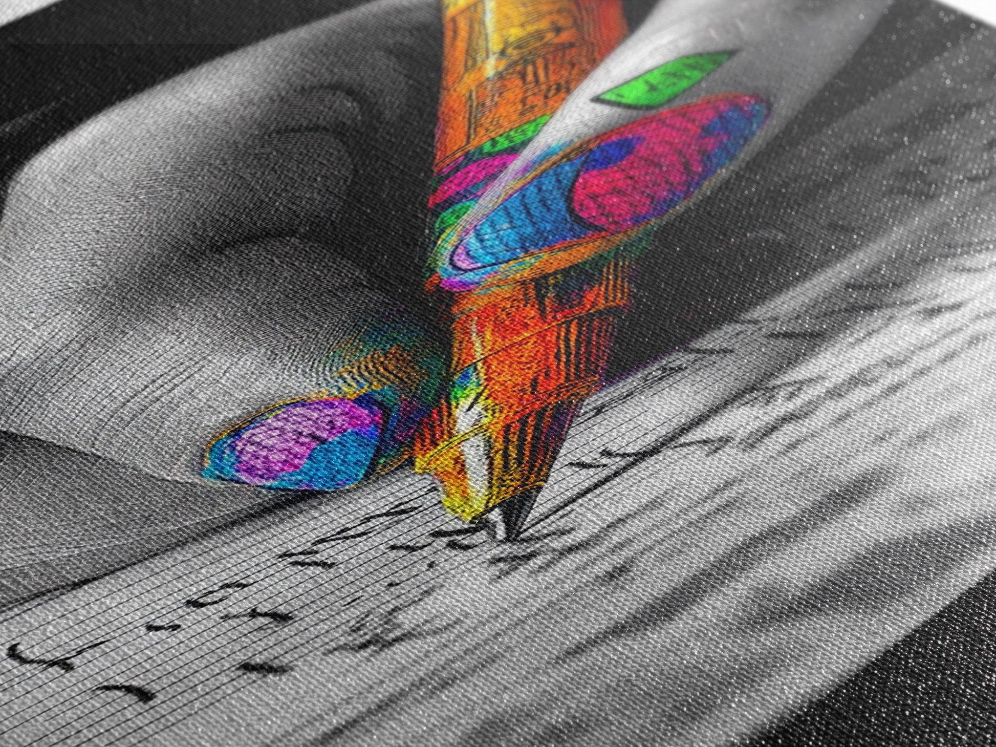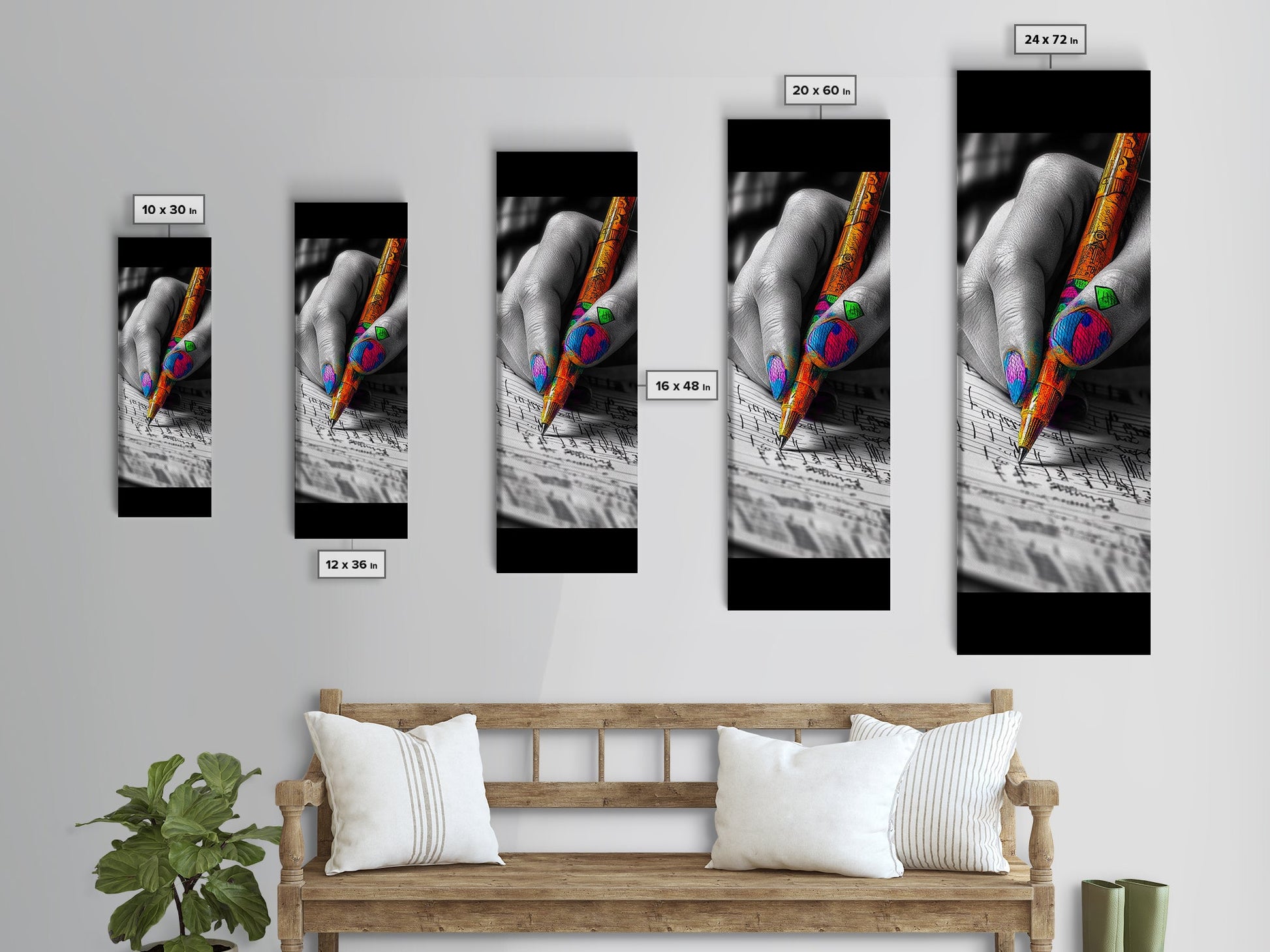 Vibrant Nails, Artistic Pen, Writing Closeup, Framed Canvas Print, Bold Office Wall Art, Pop Art Style, Creative Studio Decor