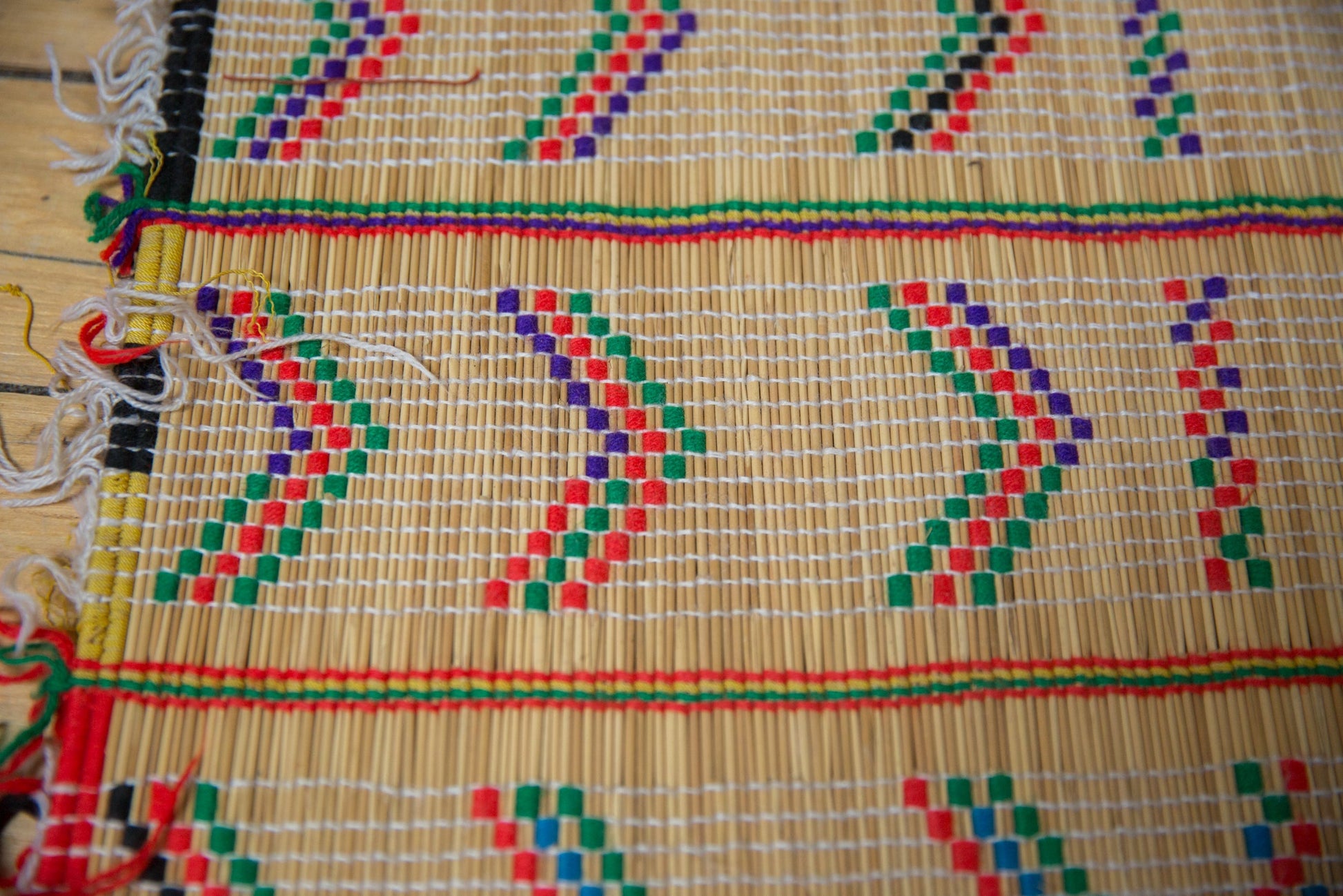 :: Vintage handmade African tuareg rug mat. Circa 1980s, this handwoven rug mat is full of character and charm. Believed to be made by the Tuareg people in/around Niger. When making, the weavers would often merge multiple pieces of straw together by inserting one into another to create a piece long enough to weave. Sold in as found vintage handmade condition. In some cases flushing clean water through the mat may be needed in order to clean it, though please note that doing so makes all sales final. Sizes vary in some cases from end to end and side to side. Measurements exclude warps/tassels. Size measures: 1'4" x 2'3".