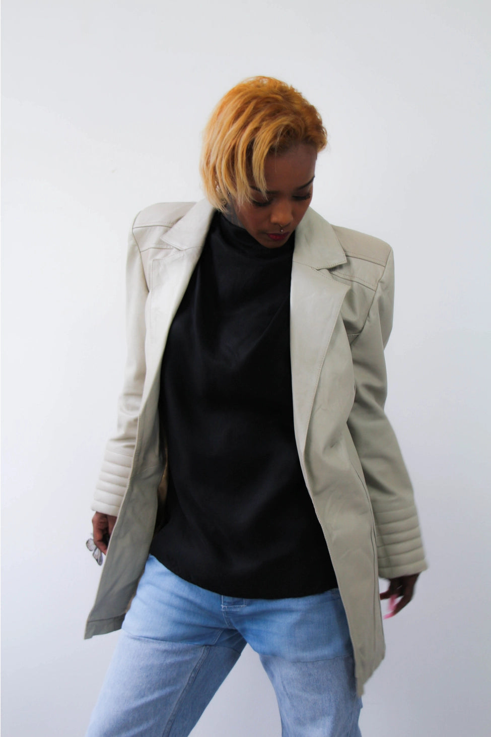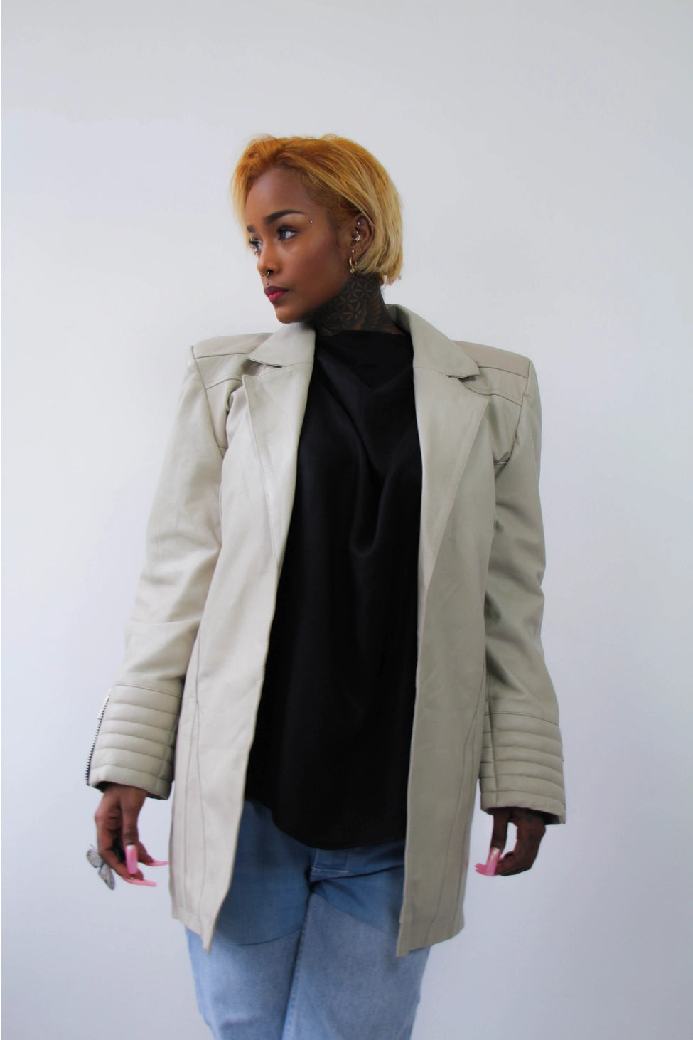 Beige leather jacket with exaggerated shoulders. Sheepskin leather with YKK zippers and poly lining.