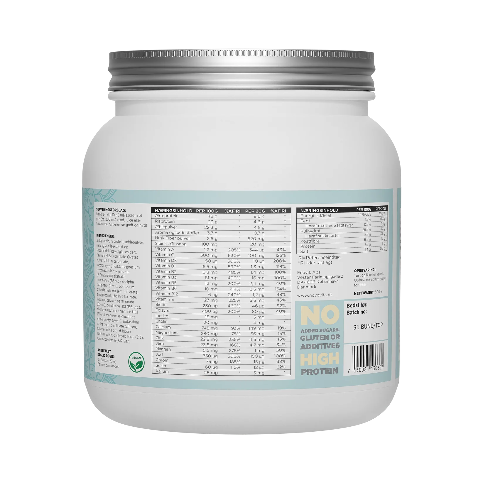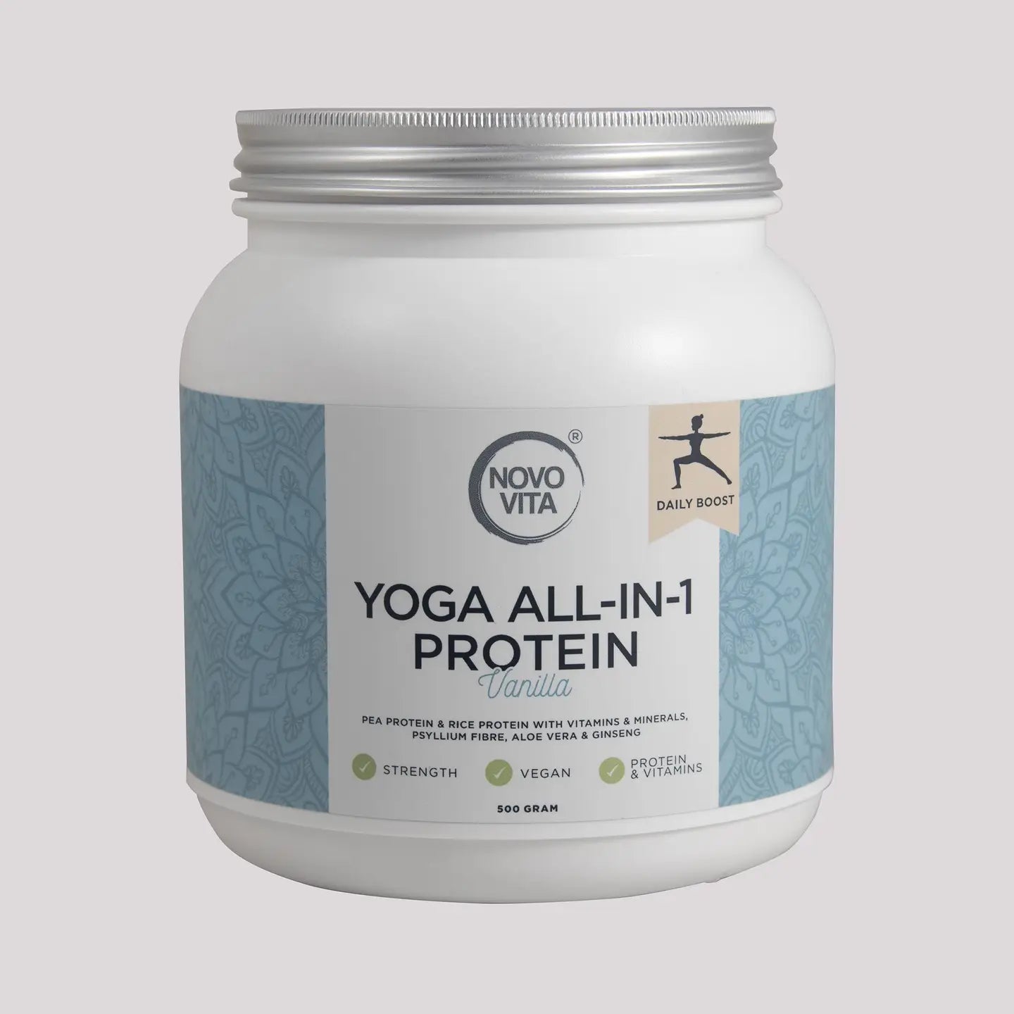Yoga All-In-1 Protein from Novo Vita is a vegan protein shake that contributes to energy metabolism, to the turnover of fats and to reduce fatigue and exhaustion. Yoga All-In-1 Protein is part of the “strength” line in the yoga series, which is for you who need strength after your workout, or just extra protein in your diet. People who live a vegetarian or vegan lifestyle, in particular, may benefit from extra protein in the diet. Our Yoga protein can usefully be added to your daily breakfast routines or in your snacking. Yoga All-In-1 Protein is a vegan dietary supplement in the form of a protein supplement that contains a blend of pea and rice protein, essential vitamins and minerals, Husk fibers, Aloe Vera and Siberian Ginseng.